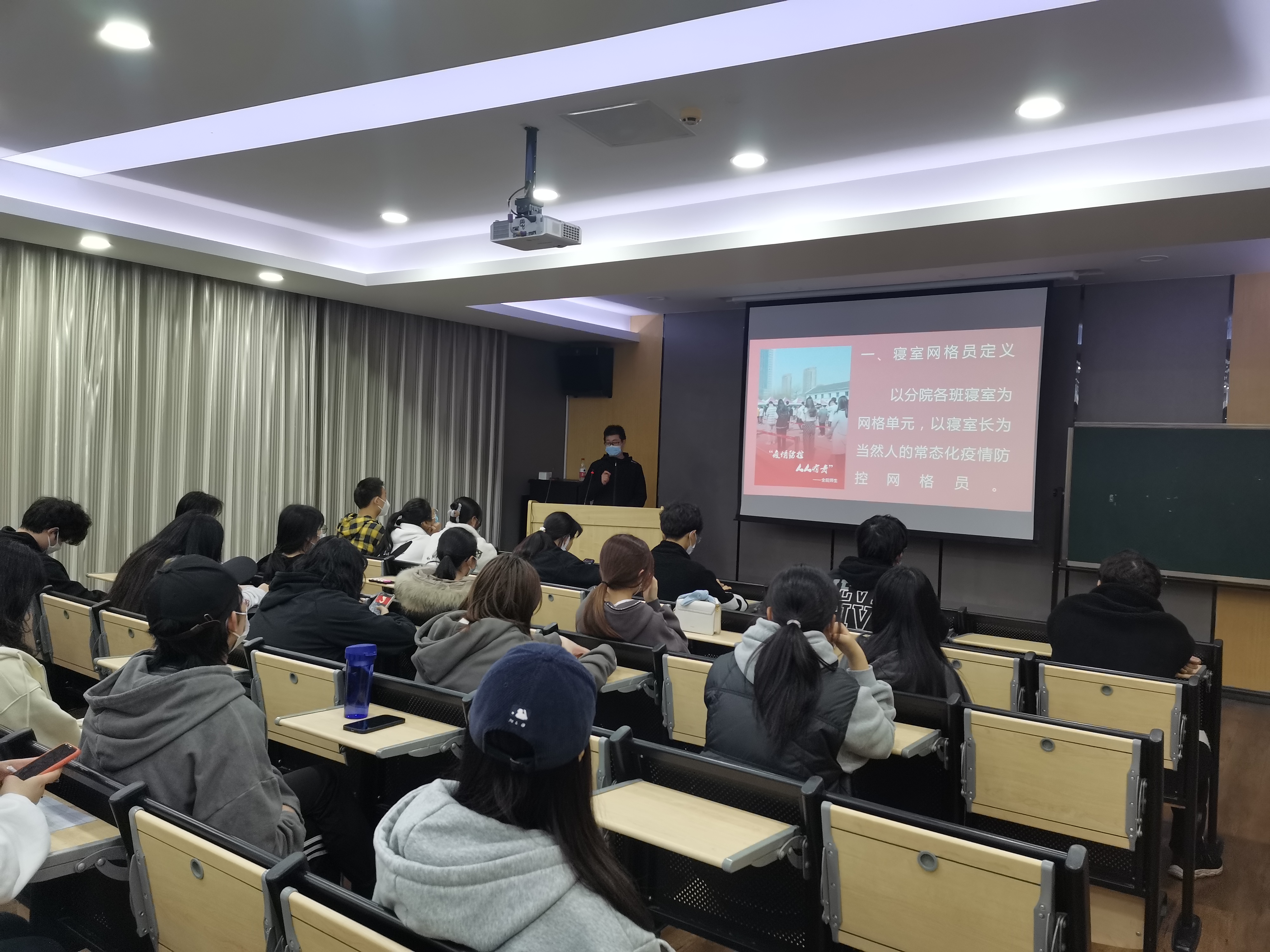会上,分院对疫情防控工作进行了思想教育,对前一阶段学院的整体防控举措和涌现出的师生党员、学生志愿者的战疫事迹、精神,进行了宣传教育,提高了同学们的思想认识和政治意识。其次,分院明确了“寝室网格员”的定义、职责和管理要求,提出了“做好网格员,就是最大的战疫贡献”,完善了相关纪律和要求,激励了寝室网格员的工作热情。最后分院号召全体网格员认真履职,共同筑起疫情防控最密师生网!!!