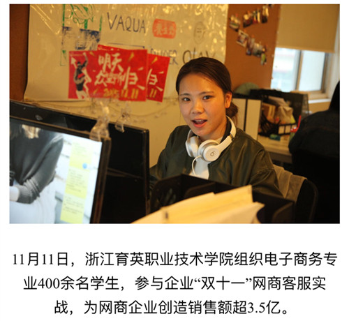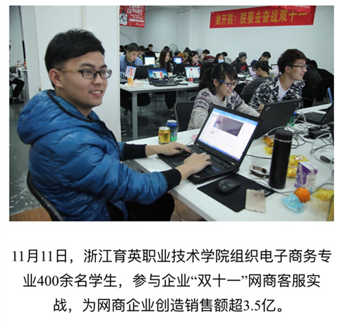 媒体看育英 联系我们 地址:杭州市钱塘区4号大街16号 邮编:310018 电话:0571-86911032、86877189 媒体看育英 当前位置:首页 >> 媒体看育英 新华网、浙江新闻报道我院学生”双十一“专题实战实训 时间:2016-03-02 11月10日-12日,我院商务贸易分院电子商务专业400余名学生参与两家电商企业“双十一”商战的客户服务工作,为企业创销售额超3.5亿元。信息技术分院计算机应用、信息管理、计算机网络专业300余名学生参与企业“双十一”网商大战的数据分析、网络维护和前台接待等工作,为三家企业创4.6亿销售额作出了贡献。新华网、浙江新闻、中国新闻图片网等媒体报道转发学院学生双十一专题实战实训。