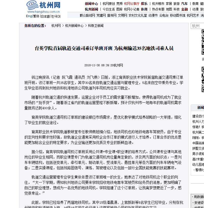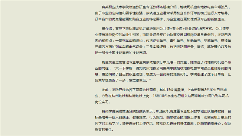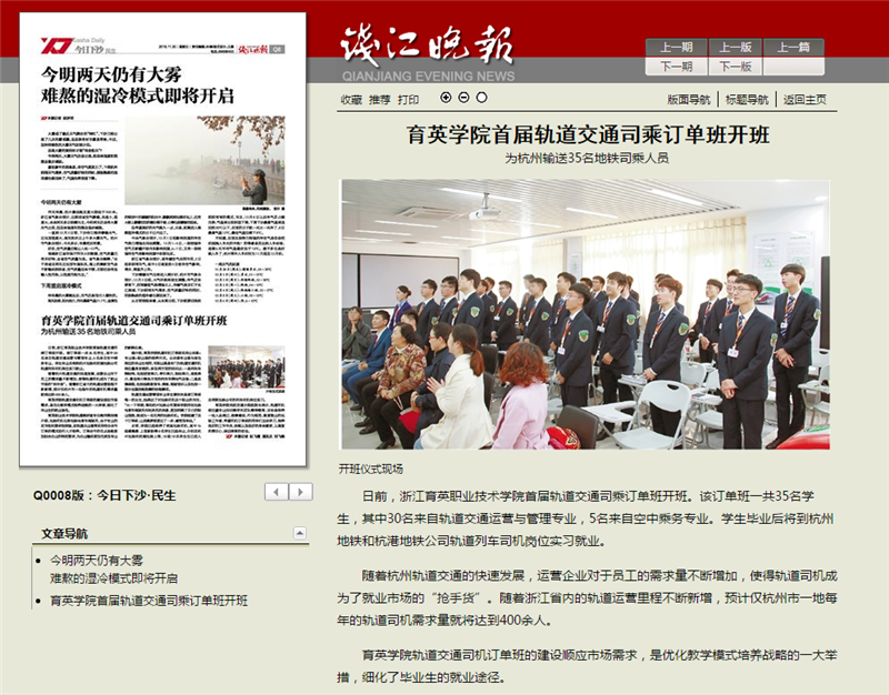 【钱江晚报】育英学院首届轨道交通司乘订单班开班