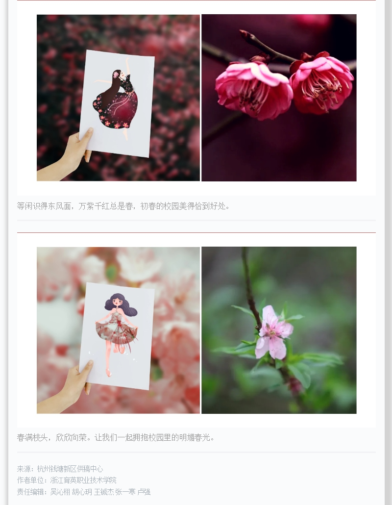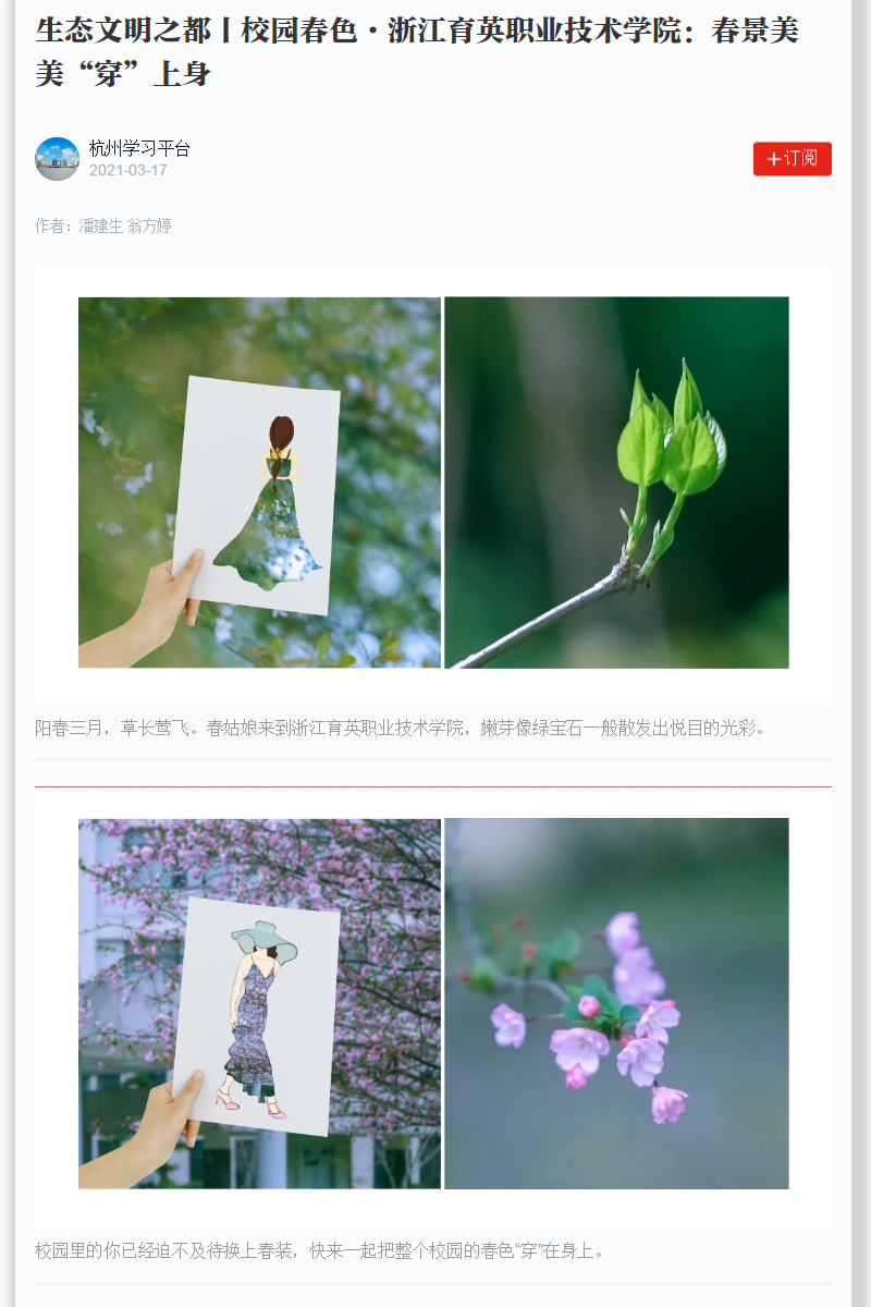 媒体看育英 联系我们 地址:杭州市钱塘区4号大街16号 邮编:310018 电话:0571-86911032、86877189 媒体看育英 当前位置:首页 >> 媒体看育英 【学习强国】生态文明之都丨校园春色·浙江育英职业技术学院:春景美美“穿”上身 时间:2021-03-18