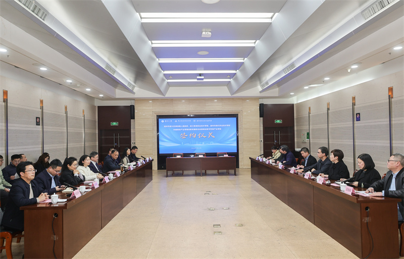 在全场嘉宾见证下,浙江育英职业技术学院校长丁金昌,埭溪镇党委书记汤雪东,湖州市现代农业技术学校校长吕富分别代表三方签约。