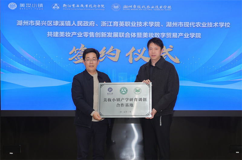 浙江育英职业技术学院向埭溪镇美妆小镇授予“美妆数字贸易产业学院”“育英-美妆小镇直播电商创业孵化基地”“美妆小镇产学研育训创合作基地”牌匾。