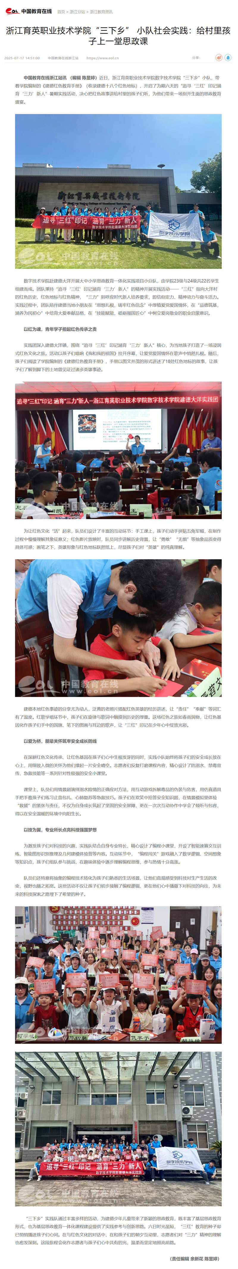 星空国际游戏厅浙江站讯 (编辑 陈显婷)近日,浙江育英职业技术学院数字技术学院“三下乡”小队,带着学院编制的《建德红色教育手册》(收录建德十八个红色地标),开启了为期六天的“追寻‘三红’印记涵育‘三力’新人”暑期实践活动,决心把红色故事讲给村里的孩子们听,为他们带来一场别开生面的思政教育盛宴。