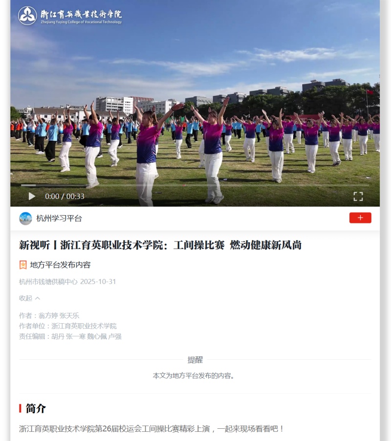 媒体看育英 联系我们 地址:杭州市钱塘区4号大街16号 邮编:310018 电话:0571-86911032、86877189 媒体看育英 当前位置:首页 >> 媒体看育英 【学习强国】新视听丨浙江育英职业技术学院:工间操比赛 燃动健康新风尚 时间:2025-11-01