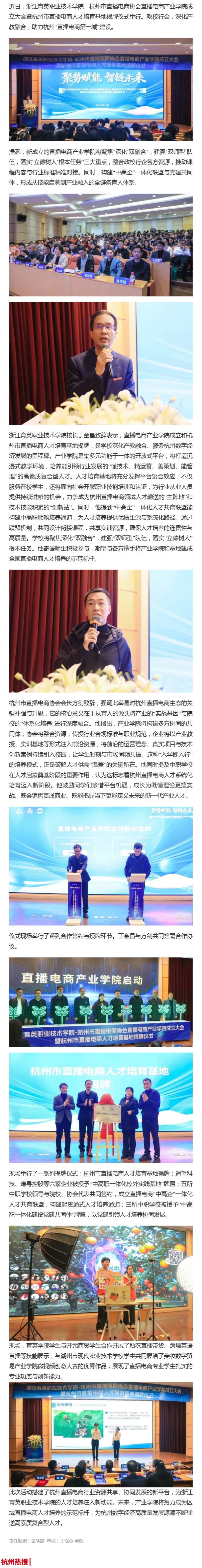 近日,浙江育英职业技术学院—杭州市直播电商协会直播电商产业学院成立大会暨杭州市直播电商人才培育基地揭牌仪式举行。政校行企,深化产教融合,助力杭州“直播电商第一城”建设。