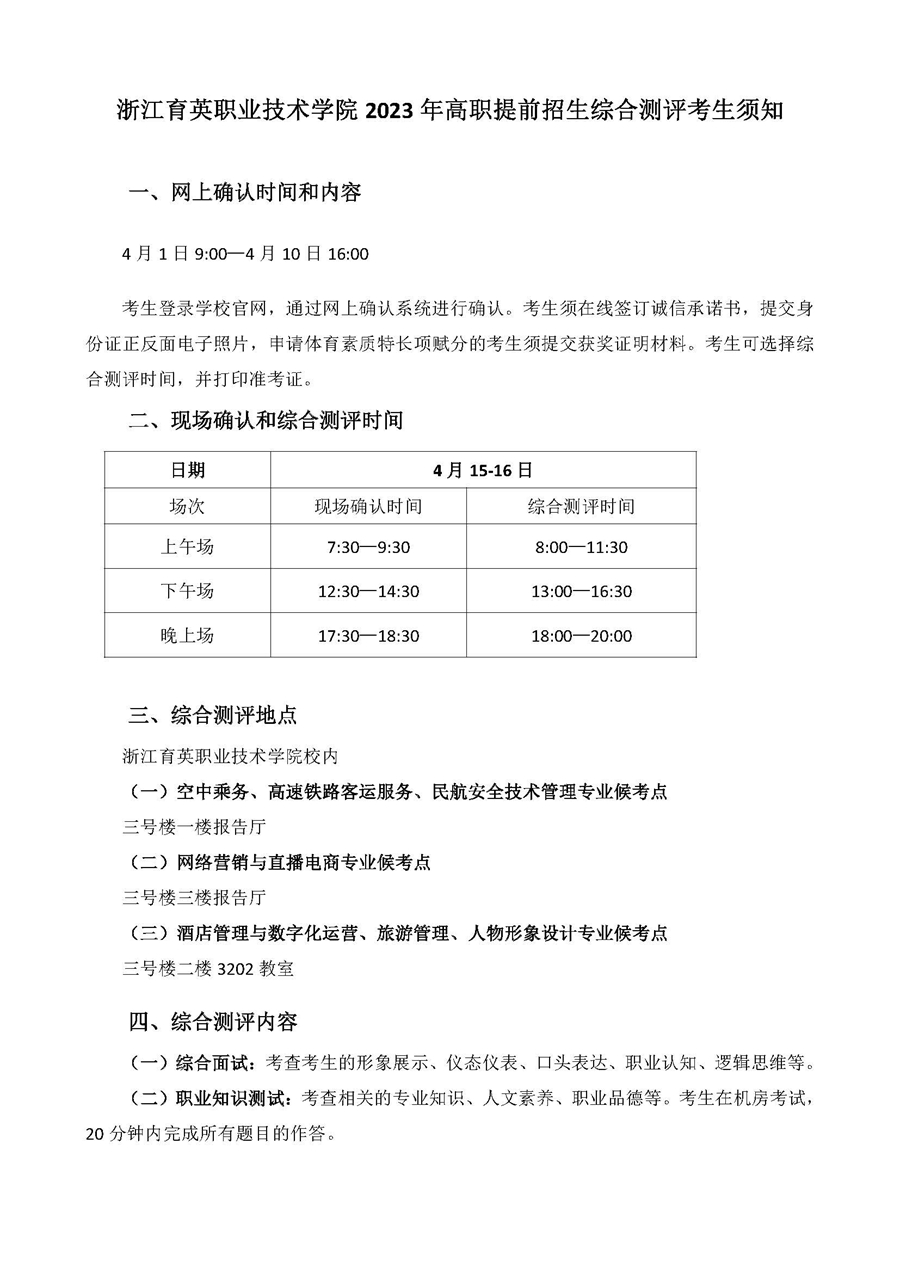 招生咨询 招生公告 报考指南 提前招生 历年分数 2025年招生专栏 录取查询 在线咨询 联系我们 地址:杭州市钱塘区4号大街16号 邮编:310018 电话:0571-86911032、86877189 报考指南 当前位置:首页 >> 招生咨询 >> 报考指南 浙江育英职业技术学院2023年高职提前招生综合测评考生须知 时间:2023-04-01