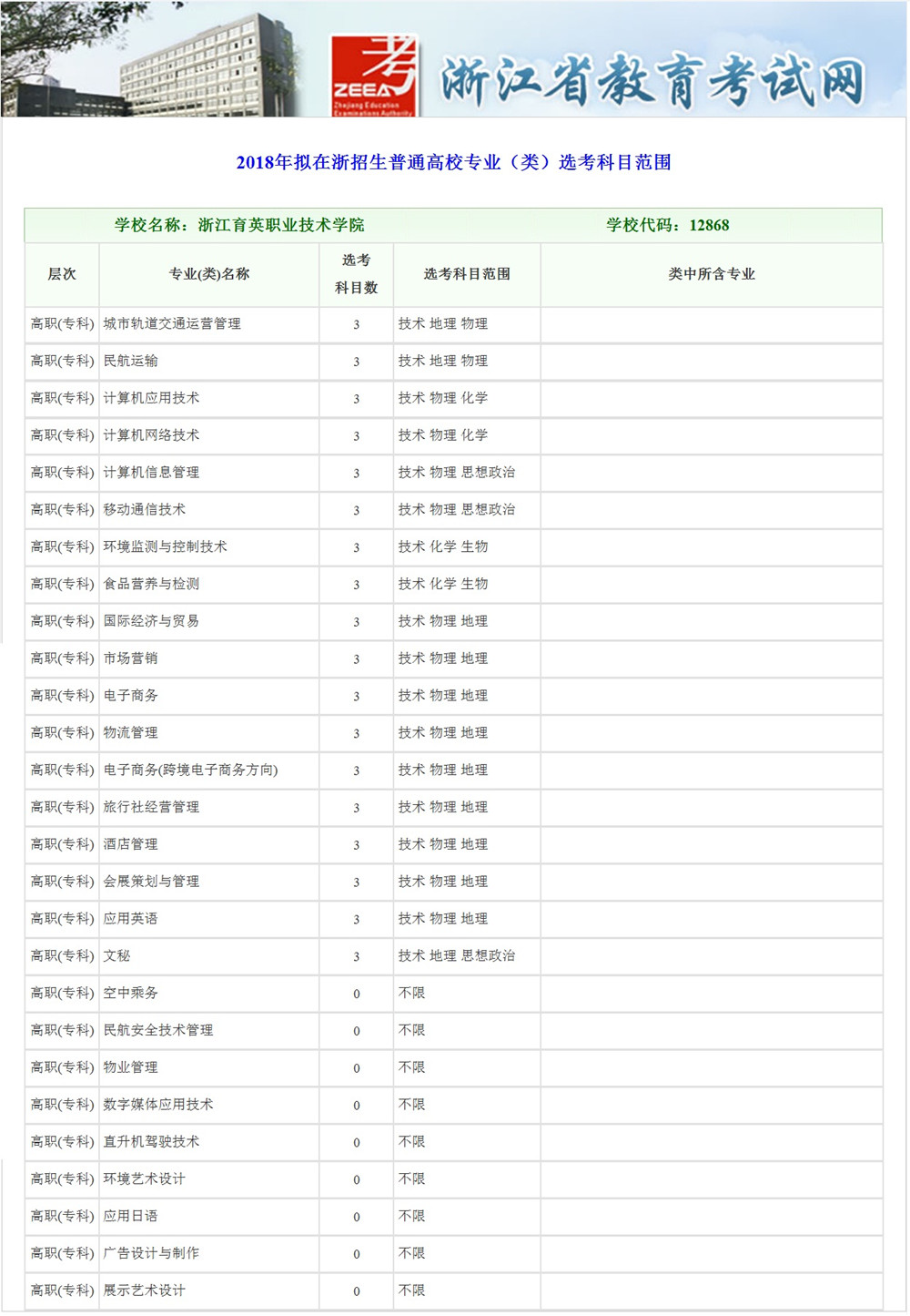 学院2018年在浙招生普通高校专业(类)选考科目范围