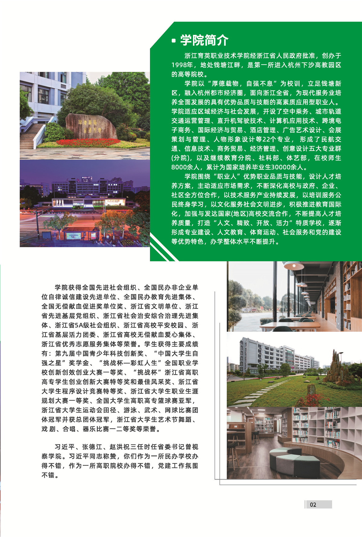 招生咨询 招生公告 报考指南 提前招生 历年分数 2025年招生专栏 录取查询 在线咨询 联系我们 地址:杭州市钱塘区4号大街16号 邮编:310018 电话:0571-86911032、86877189 招生公告 当前位置:首页 >> 招生咨询 >> 招生公告 浙江育英职业技术学院2021年高职提前招生简章(彩页) 时间:2021-03-04