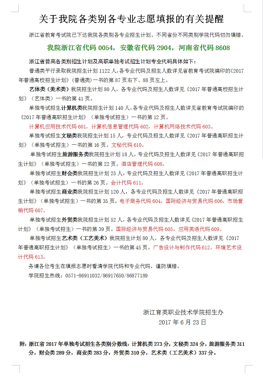 招生咨询 招生公告 报考指南 提前招生 历年分数 2025年招生专栏 录取查询 在线咨询 联系我们 地址:杭州市钱塘区4号大街16号 邮编:310018 电话:0571-86911032、86877189 招生公告 当前位置:首页 >> 招生咨询 >> 招生公告 关于我院各类别各专业志愿填报的有关提醒 时间:2017-06-24