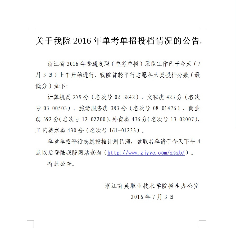 关于我院2016年单考单招投档情况的公告