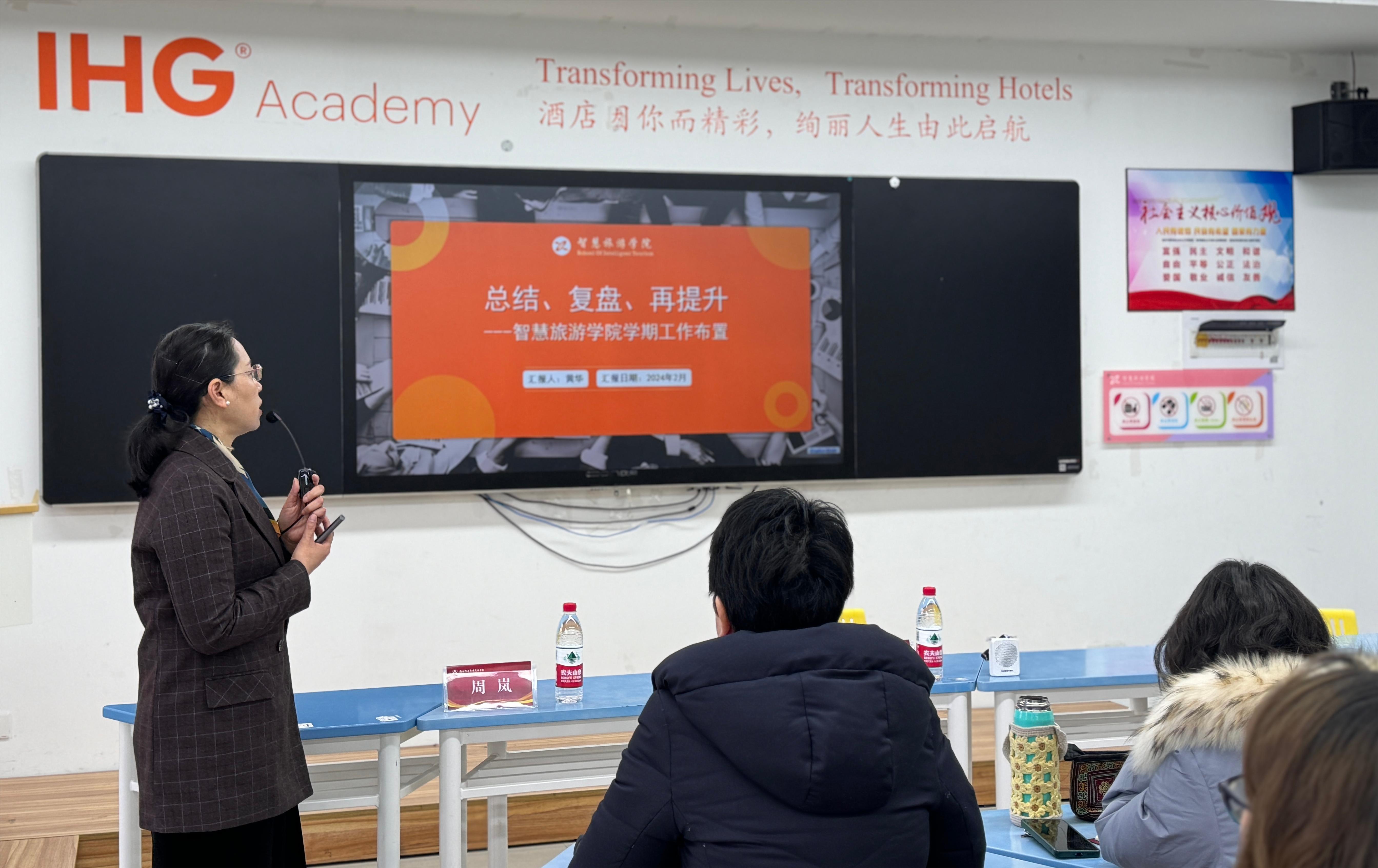 会议第三项,学院领导给老师颁发专业技术聘书。希望老师们牢记教育初心使命,再接再厉,以身作则,率先垂范,砥砺前行!表彰之后黄华院长做学期工作布置,传达了学院党政工作会议精神。对上学期工作做了简单回顾,并对本学期工作进行了逐项解读,在会上作了“总结、复盘、再提升”主题工作报告,学院全体教师认真学习,聚力学院新发展。新学期旅游学院将继续实施“岗课赛证”综合实践育人,加大“专业-职业-岗位、课程-能力-比赛“教改力度,以“三三三”职业素养体系为育人载体,培养学生“三种精神”,形成“和合共融 务实创新”院风,培养“国际化、品质化、数智化”的高品德高素质复合型旅游管理人才。讲话最后,黄院长希望学院全体教师可以在新的学期以更饱满的精神状态进入新的征程,团结协作,迎接挑战。