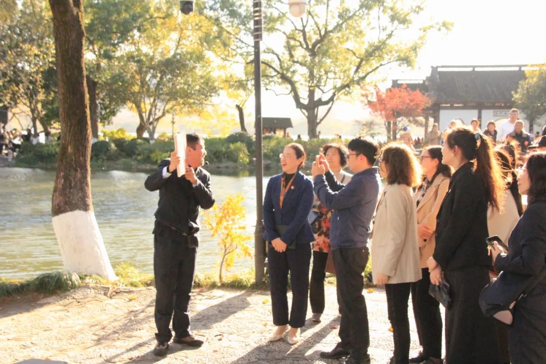活动由西湖游船团委书记刘倪华、我校西湖游船实习生21旅管B史仕权共同主持。红色画舫忆初心。如果说历史是最好的教科书,那么开启一段湖上专属“红色船旅”就是一次重温红色回忆、践行初心使命的绝佳体验。此次活动乘坐的这艘1比1还原清明上河图画舫的“兰栧号”画舫,其背后的故事可不一般。何书记介绍,作为G20峰会元首接待用船的两艘船之一,兰栧号最早诞生于1989年,是西湖上首艘豪华画舫,船体满是中国风。游船是西湖的眉目,流动的风景,是西湖世界文化景观遗产的重要组成部分。世人眼中妩媚多姿,温柔秀美的西湖,也曾怀抱了中国共产党人的初心和使命、情怀与担当。寻访足迹担使命。此次“红色船旅”主打“追随足迹”现场学形式,沿途“打卡”一系列体现西湖红色印记的代表性旅游景点和纪念场所,游览内容非常丰富。从湖滨码头出发,随着船只徐徐前行,沿途观赏湖滨公园、断桥、白堤、平湖秋月等著名景点,最后登临三潭印月“小瀛洲”,跟随“红色船旅”定制专线资深讲解员的脚步,沿着九曲桥,通过实景、实物与“红色系列历史画片”相结合,寻访毛泽东同志、刘少奇同志、周恩来同志、邓小平同志四位伟人相关的四处红色印记,聆听柔情的西湖之水诉说这一段段闪烁着星星之火的红色历史。党建共建谋发展。红色游线体验结束,双方就红色资源开发、红色游线精品打造、红色宣讲员培养和实习实践基地建设等方面展开了深入的探讨。校企双方达成党建共建协议,发挥好党建引领、结对共建的凝心聚力作用,聚焦组织、阵地、活动、服务、队伍等方面深化合作,探索“校企联动 实践育人”的融合模式,凝聚共识、凝聚智慧、凝聚力量,着力在课程建设、教学创新、育人特色等方面出实招、下功夫、求实效,为校企高质量发展增添新的活力。