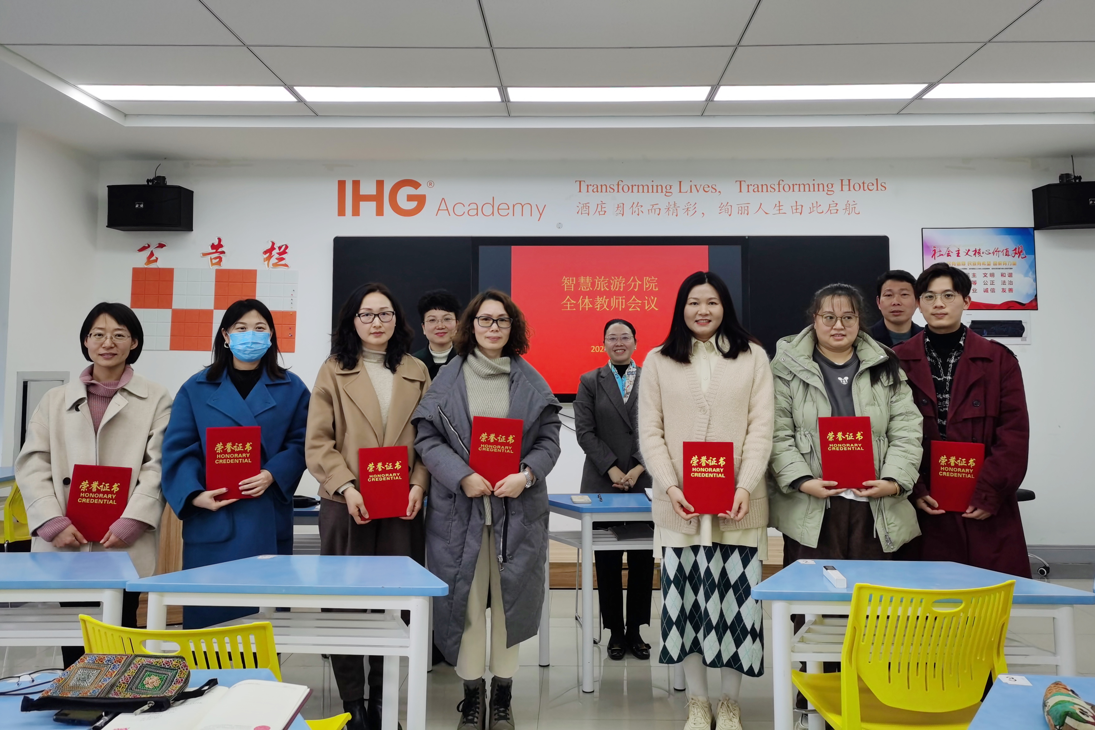 会议第三项议程。表彰2021-2022学年第一学期分院学风建设先进个人,周副院长宣读表彰文件,由分院三位领导向先进个人颁发荣誉证书。三位领导对获奖的个人表示祝贺,赞扬了在各自岗位上默默奉献的各位教师,以及奋发进取的各位同学,指出在分院师生的共同努力下,旅游分院已形成了良好的学风建设体制,希望受到表彰的先进班级和优秀个人再接再厉,发挥垂范表率作用。