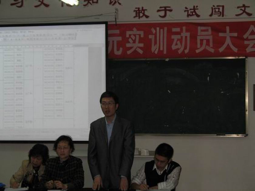 外经系文管教研室和实践教研室密切合作,历时一周时间充分准备,06文管班“百元实训”动员大会,于2008年4月21日上午8点整,在文管实训室如期顺利的举行了系主任贺存乡老师、负责实践课程管理的教务处副处长王彤老师、文管教研室负责人王广平老师、实践教研室林昌平老师以及该项目的指导老师参加了会议,会议由林昌平老师主持。