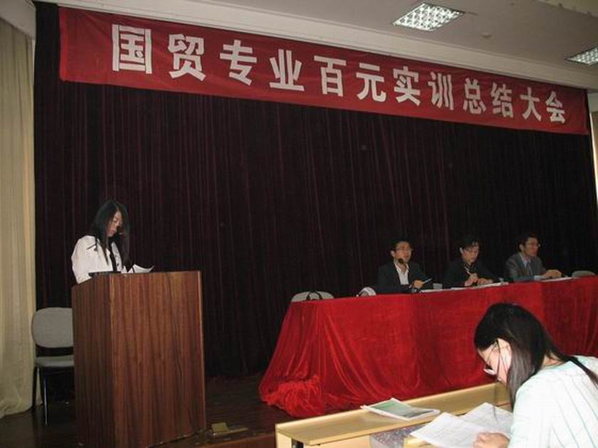 2008年4月18日上午8时,06国贸专业百元实训总结交流大会在一楼报告厅隆重举行,会议由实践教学秘书林昌平老师主持,教务处王彤处长,系贺存乡主任,国贸教研室指导教师及相关班主任参加了此次会议。