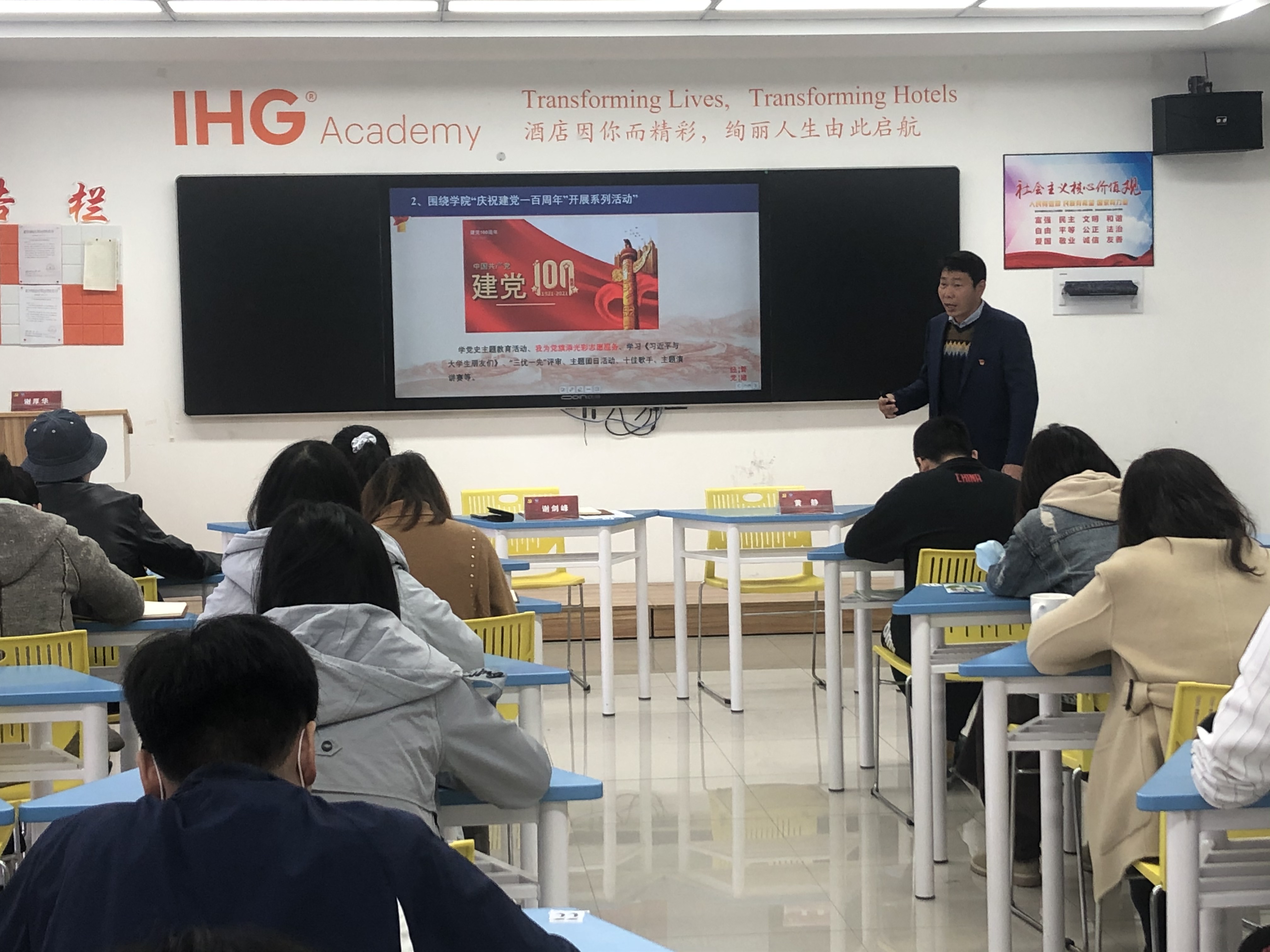 随后,谢剑峰同志总结了2020年完成的党建工作,包括:党总支换届、洲际酒店党建共建、推进校社党建品牌深化、外出学习考察、集中学习十九届五中全会精神等重要党建工作的推进和各类党务工作取得的成绩。最后一部分,谢剑峰书记根据学院党委工作意见和《2021年党政工作要点》,结合分院实际,梳理了本年度主要党务工作,其中包括庆祝建党一百周年系列活动、深入开展校社校企党建共建、各项党建活动评比、各类党建思政课题申报等。面对本年度各项工作和任务,全体党员均表示信心满满,以最后的状态迎接建党一百周年。
