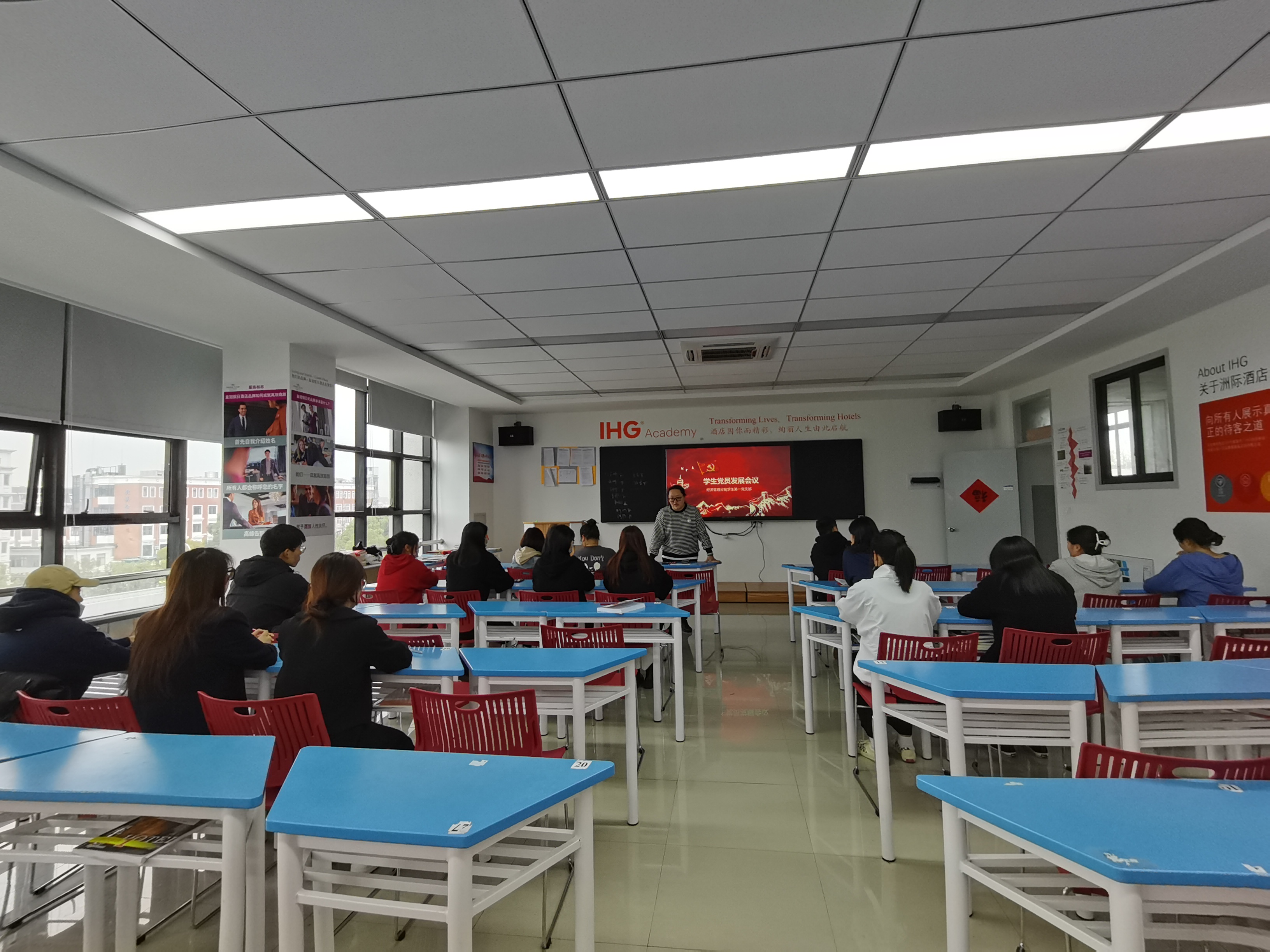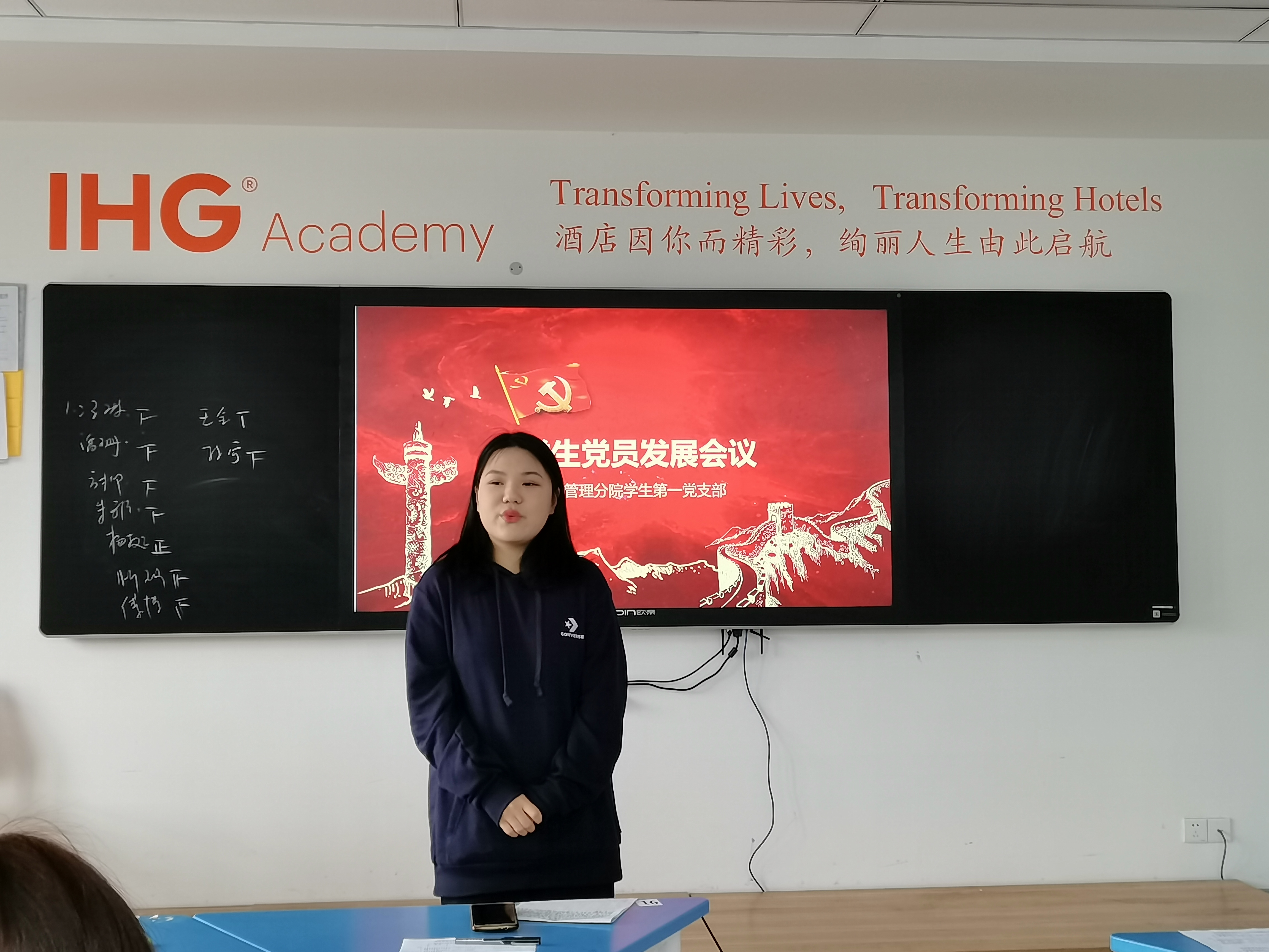 会议首先由支部书记庞璁发表讲话。庞书记首先指出了大家在党支部规模不断壮大的同时应更加注重保持党员的先进性,时刻严格要求自己;同时,庞璁希望本次的发展对象能够端正入党动机,做好接受党组织考验的准备。紧接着,本次发展对象19日语五年一贯制的潘旎旎同志上台讲述了自己的入党动机、入党历程和对党的理解和认识,同时结合自己的实际情况表达了自己加入中国共产党的决心和强烈愿望。在发展对象讲述完毕之后,作为入党介绍人的正式党员和预备党员代表发表了对发展对象的意见。在最终的投票表决阶段,潘旎旎同志顺利通过了现场正式党员半数以上的投票。然后预备党员潘旎旎同志表明决心坚决服从组织,继续努力,全心全意为人民服务。最后,庞璁老师对发展成为预备党员的同学表示祝贺,并对参会的全体学生党员提出了新的希望和具体的要求,希望各位学生党员能认真履行党员义务,始终牢记党员身份,在平时的思想、工作、生活中,要起到模范带头作用,充分发挥和体现出党员的先锋模范带头作用,更好地影响身边的同学,为同学们服务。