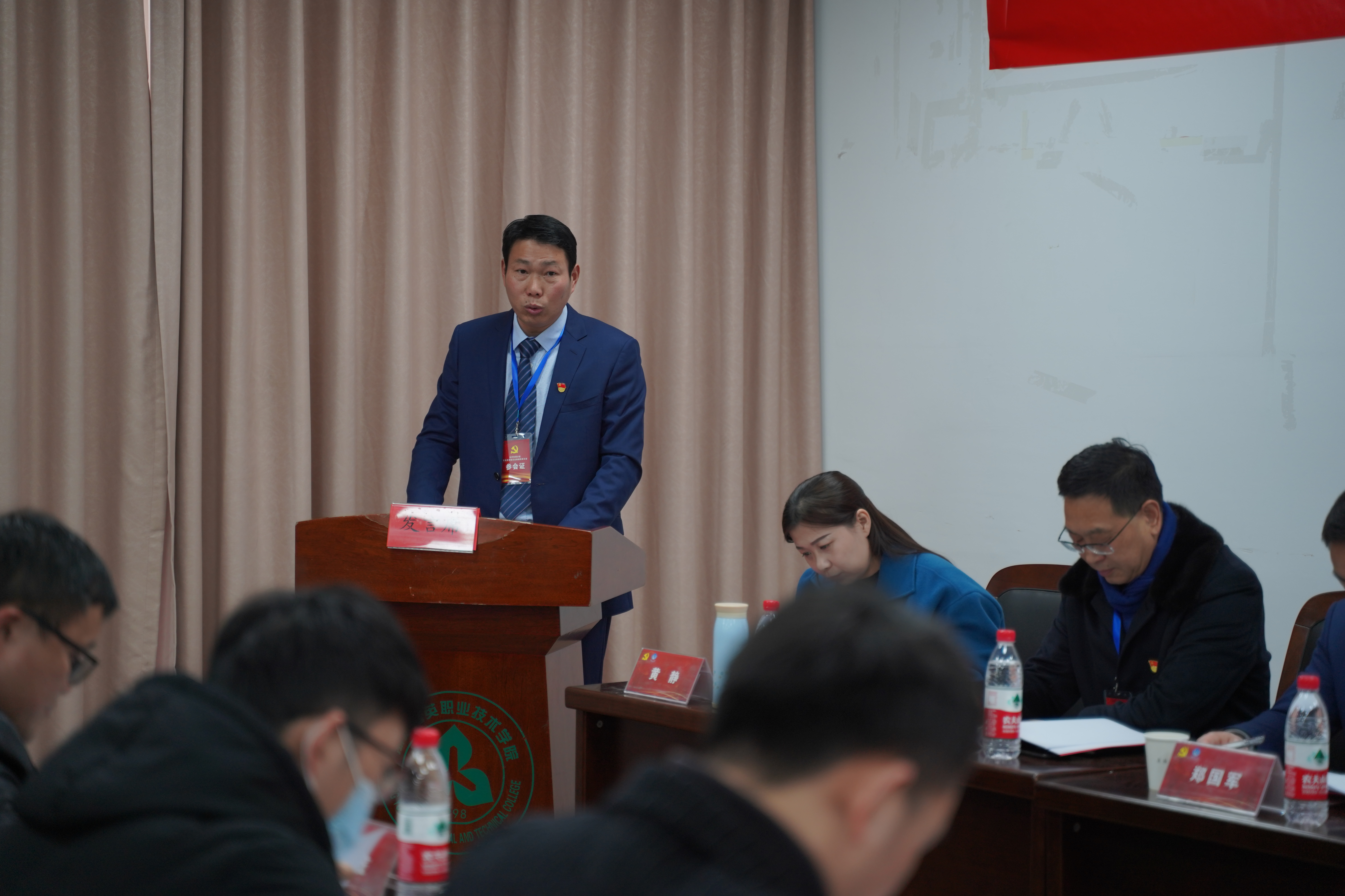 商贸分院党总支书记姜蕾同志致贺信,她向经管分院党总支部表示祝贺,也希望各分院党总支部都能相互学习,共同提高,携手推进党的建设工作。