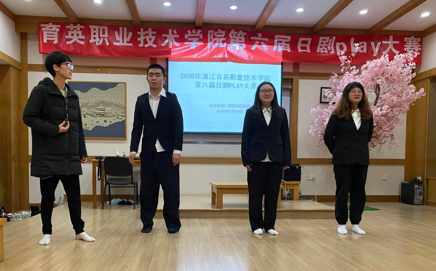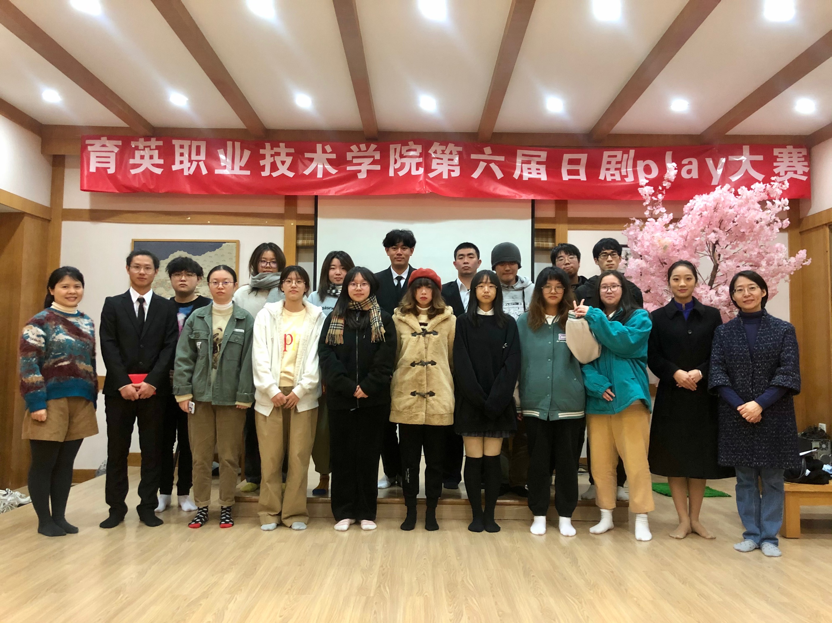 浙江育英职业技术学院第六届日剧play大赛于2020年11月24日14:30在3109日本文化实训室举行。本次比赛由樱花日语协会主办,日语教研室的何露丹老师、张婵娟老师、傅晶老师担任本次比赛的评委。樱花日语协会组织部部长曹小凤主持,20日语五年一贯制、19日语五年一贯制、19日语3个日语专业的班级组队参加。 “育英日语人”化身为“戏精”,认真了演绎我们的精彩日剧。其中涌现了很多栩栩如生的人物形象。360度无缝化了自黑烟熏妆的中年妻管严大哥、天真烂漫的小猪、为了守护信念为“英勇献身”的勇士、积极配合团队报数的搞笑达人。