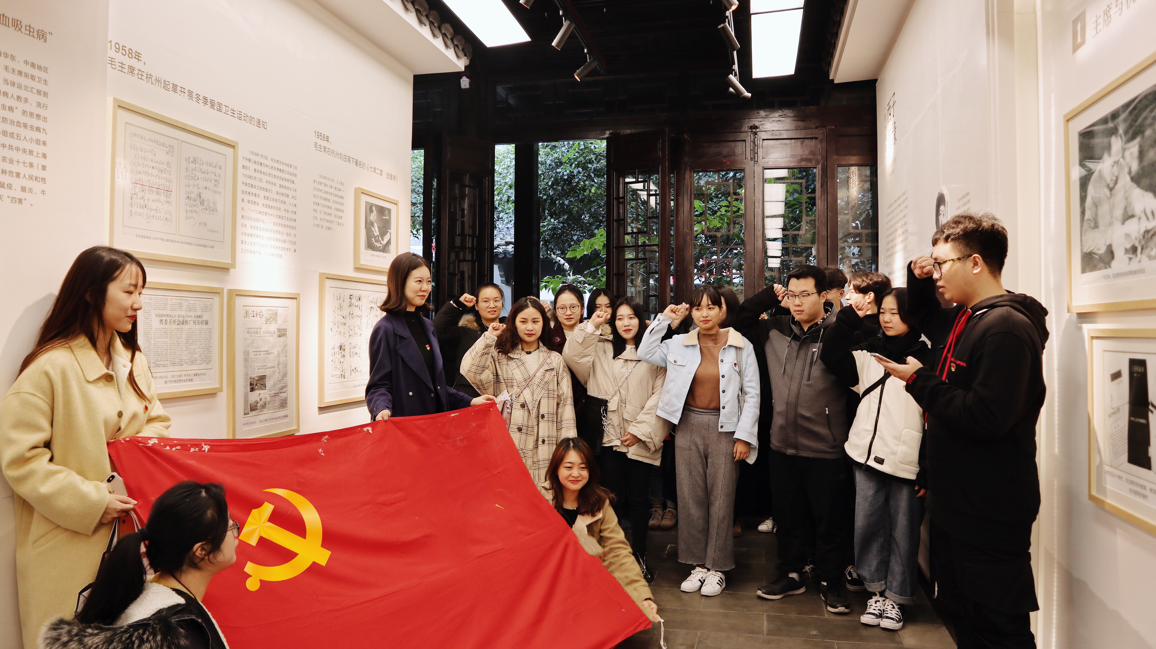 刚走进小营巷,就看到街道干净整洁,家家户户窗明几净,一尘不染。在杭州这个日新月异的现代化都市中,高楼耸立,小营巷社区依旧保持着粉墙黛瓦、飞檐翘角的原貌,有学生党员说:“这里的环境真好,能让浮躁的心平静下来。”在60年前的1958年1月5日,毛主席亲临小营巷,视察爱国卫生工作,亲切的与居民谈心,对居民区卫生工作给予很高的评价。这既肯定了杭州的卫生工作,有极大的鼓舞了全国人民,掀起了一场群众性爱国卫生运动高潮。我们在支部书记带领下参观了毛主席视察小营巷纪念馆,馆内展示了各届领导人视察小营巷的事迹和小营巷发展的历史沿革,学生党员在参观中充分领略了这条红色小巷在改革开放四十年来的不断变化,学习“小营人”艰苦创业,勇于开拓的精神,小影响在打响传统爱国卫生品牌的同时,伴随社会前进脚步,从环境综合整治到全民健康教育这样一条特色鲜明的社区卫生发展之路。在纪念馆后院,看到几口大水缸一字摆放,这就是毛主席参观小营巷时的水缸,当年毛主席亲自打开水缸检查里面有没有蚊子幼虫。2003年12月19日,时任浙江省委书记的习近平前来调研,时任社区主任陈慧芳告诉习近平,他旋即附身打开同一口水缸查看。抚今追昔,他感慨地说,毛主席当年如此重视卫生工作,我们各级党的干部更要把人民群众的身体健康摆在心里、抓在手里,健康是民生之源。