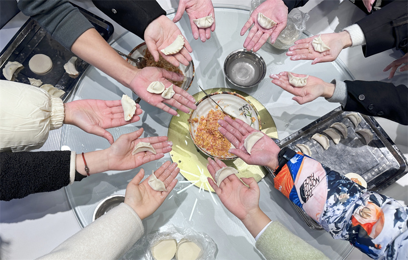 “面皮放掌心,取适量肉馅,手指沾一沾清水沿面皮一周,对折中间捏实,左边捏褶子,换个方向右边捏褶子,一个胖嘟嘟的饺子就包好了。”在老师的指导下,老挝留学生普萨瓦包好了一个饺子,脸上露出开心的笑容,并拿起手机拍照,把中国美食发给远方的亲朋好友。