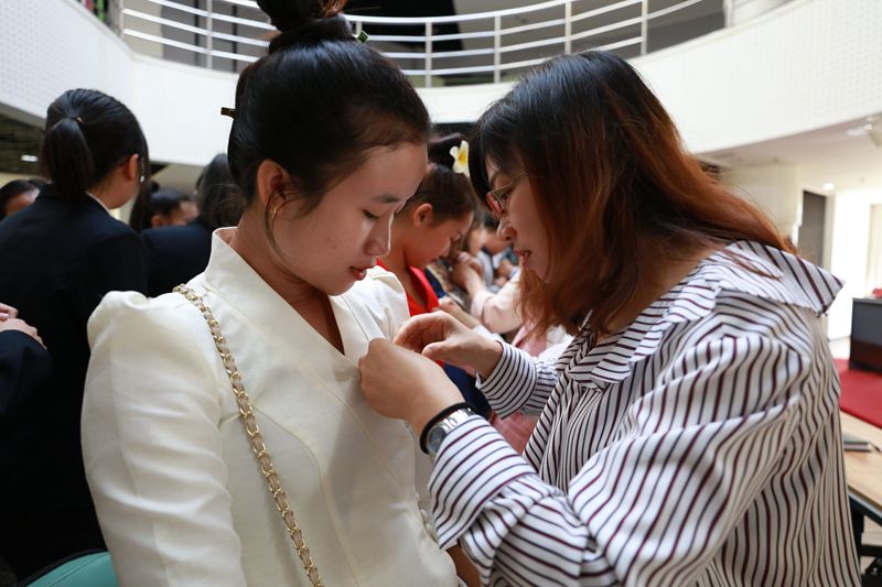 任课教师代表葛秀华发言,她表示老挝班是中老(中国-老挝)两国友谊之花,育英学院是留学生在中国的“家园”,希望老挝学生在这里保持老挝人民的热情洋溢、彬彬有礼,为校园增添更美丽的风景,祝愿同学们在育英的三年学有所成,学成后报效祖国,并撒播中老友谊的种子。