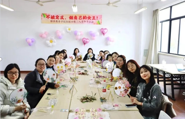 冬去春来,芳菲初绽花香渐浓,微风渐暖。“三八”国际妇女节也将如期而至。为了热烈庆祝这个特殊的日子,3月7日,在温馨的3号楼3218教室,继续教育学院妇联小组和团学组织共同为学院女教职工们举行了一场主题为“不被定义,做自己的女王”的三八妇女节活动。 在这个创意团扇之旅中,每一位老师都化身为艺术家,用她们的心灵手巧将春天的气息永久地封存在团扇之中。她们挑选着自己中意的干花,用镊子夹花,把涂上胶水的干花压在扇面上,把春天的痕迹映在团扇上。在这个过程中,老师们相互交流、相互分享,共同感受着制作团扇的乐趣,享受着这份治愈而浪漫的时光。团扇制作结束后为每位老师们送上了蛋糕与奶茶,送上心意,浓情蜜意。每一口都是诗意,每一杯都是真挚的祝福。