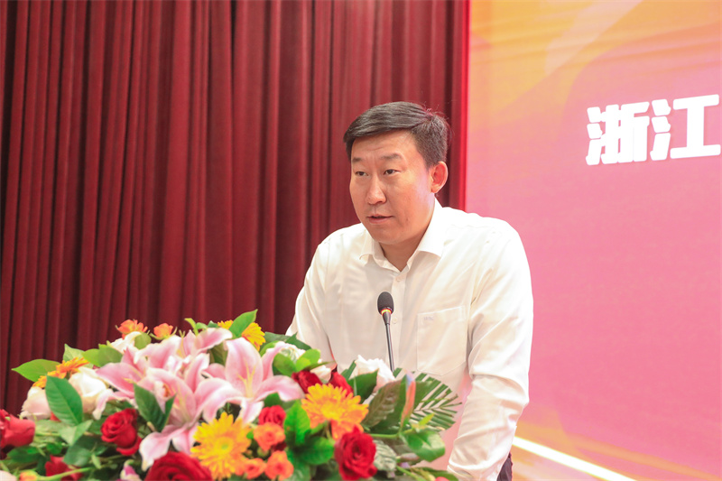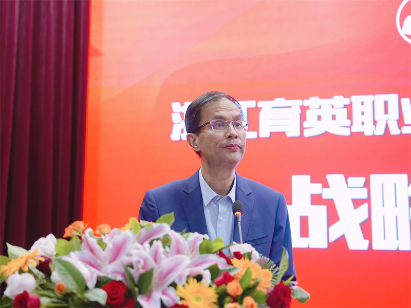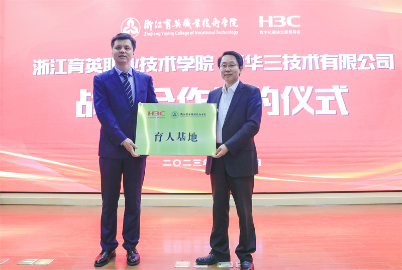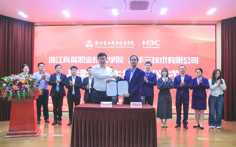 丁金昌致辞。他介绍了学校基本情况,并表示,本次战略合作签约,是学校与企业“无缝对接”,专业与产业“同频共振”,深化产教融合的实质性举措。他说,育英学院和新华三都是习近平总书记曾经视察过的单位,习近平总书记的殷切嘱托一直激励着育英人不断向前奋进。经过多年发展,学校特色和优势更加明显,所有专业紧密对接浙江省、杭州市支柱产业。自建校以来,学校坚持立德树人,主动适应市场需求,着力于培养高素质复合型技术技能人才,精心设计人才培养方案,不断深化产教融合,全面推动与头部企业全方位合作,分别成立了“育英-深信服产业学院”、“育英-海尔智家智慧零售产业学院”等产教融合载体。本次与新华三合作的信息技术专业群,在专业建设、教学改革中成果丰富,尤其是赛教融合的教学特色明显,学生在各类竞赛中获得特等奖、一等奖百余项,在浙江省乃至全国具有较大影响力。新华三集团作为数字化解决方案领导者,深度布局“芯-云-网-边-端”全产业链,不断提升数字化和智能化赋能水平。校企双方可以在人才培养、实践基地建设、团队共建、课程共享、职业证书开发、党建共建等方面进行深度合作、资源共享、优势互补,达到学校、企业、学生三位一体的有机结合,最终实现三方共赢。
