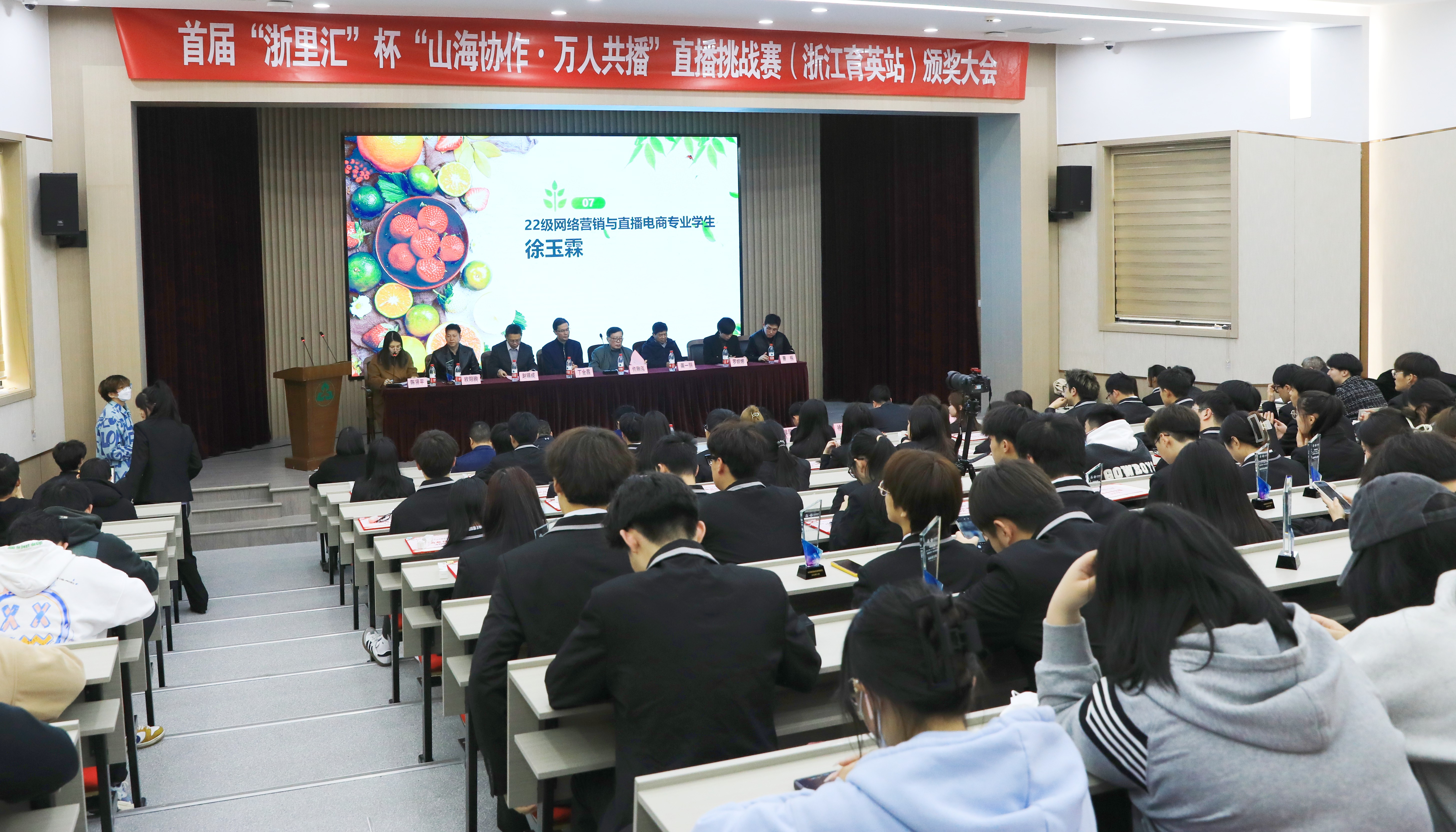 2023年3月24日下午,首届“浙里汇”杯“山海协作·万人共播”直播挑战赛(浙江育英站)颁奖大会在学校一号报告厅举行。浙江省中华职业教育社副主任、浙江省学徒制研究中心主任仉贻泓,校长丁金昌,浙江省学徒制研究中心顾问龚一朋,浙江联通公众客户销售中心副总经理兼杭州联通副总经理赵锡成,杭州联通钱塘区分公司总经理康伟伟,教务部主任罗妮娜,数字商贸学院院长欧阳驹,杭州沸讯品牌有限公司首席执行官曹振出席。数字商贸学院副院长陈贤平主持颁奖仪式。