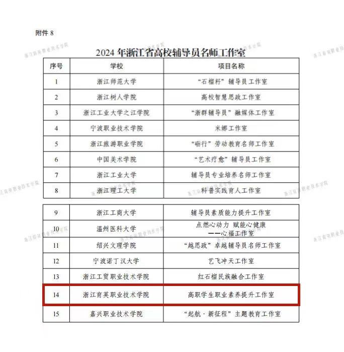 近日,浙江省2024年度高校思想政治工作质量提升综合改革与精品建设项目立项结果公布。我校“红色引领 数字赋能 深度浸润”高职学生职业素养提升工作室入选浙江省高校辅导员名师工作室。全省共计15个工作室入选,其中高职院校5所。