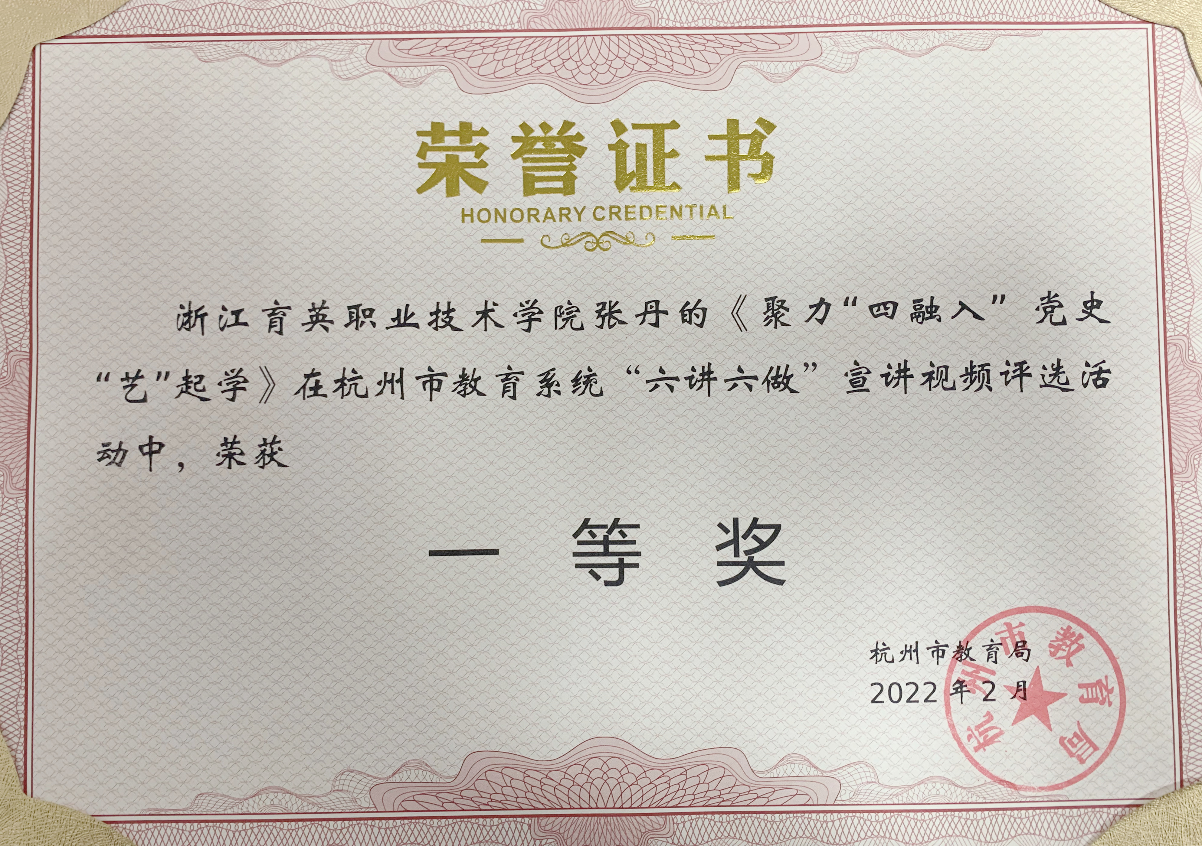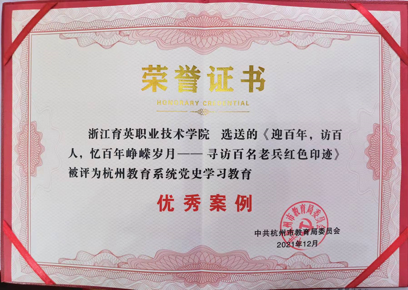 在杭州市教育局召开的教育系统党史学习教育总结暨2021年基层党建和人才工作述职评议会议中,我院荣获“百年党史暨党的十九届六中全会知识竞赛”高校教工团体三等奖等团体和个人荣誉6项,选送的《迎百年,访百人,忆百年峥嵘岁月--寻访百名老兵红色印迹》被评为杭州教育系统党史学习教育优秀案例。