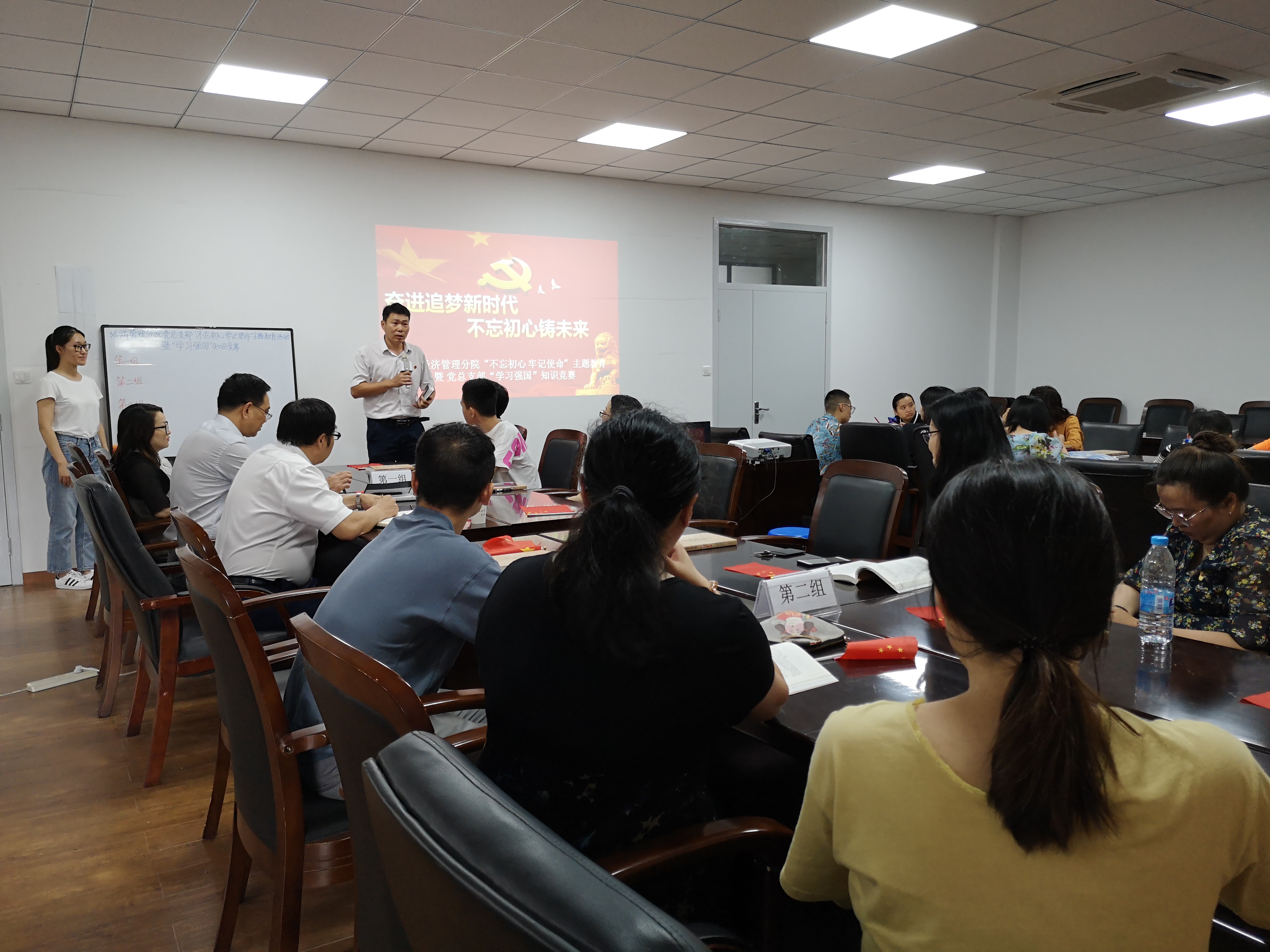 为认真贯彻党中央“不忘初心、牢记使命”主题教育领导小组印发的《关于抓好第一批主题教育学习教育、调查研究、检视问题、整改落实工作的通知》、《学院2019年党政工作要点》,根据党总支开学初的计划,教工党支部于2019年6月25日在1208A会议室举办“不忘初心 牢记使命”主题教育活动暨“学习强国”知识竞赛。旨在通过活动,抓实抓好总支党员学习教育,聚焦主题,多思多想,学深悟透,系统全面开展各项主题活动,检验大家对学习强国学习的成果,并对积分排名前的党员同志嘉奖激励,号召大家继续努力学习,不断向党组织靠近,扩充党的知识并及时进行学习反思。