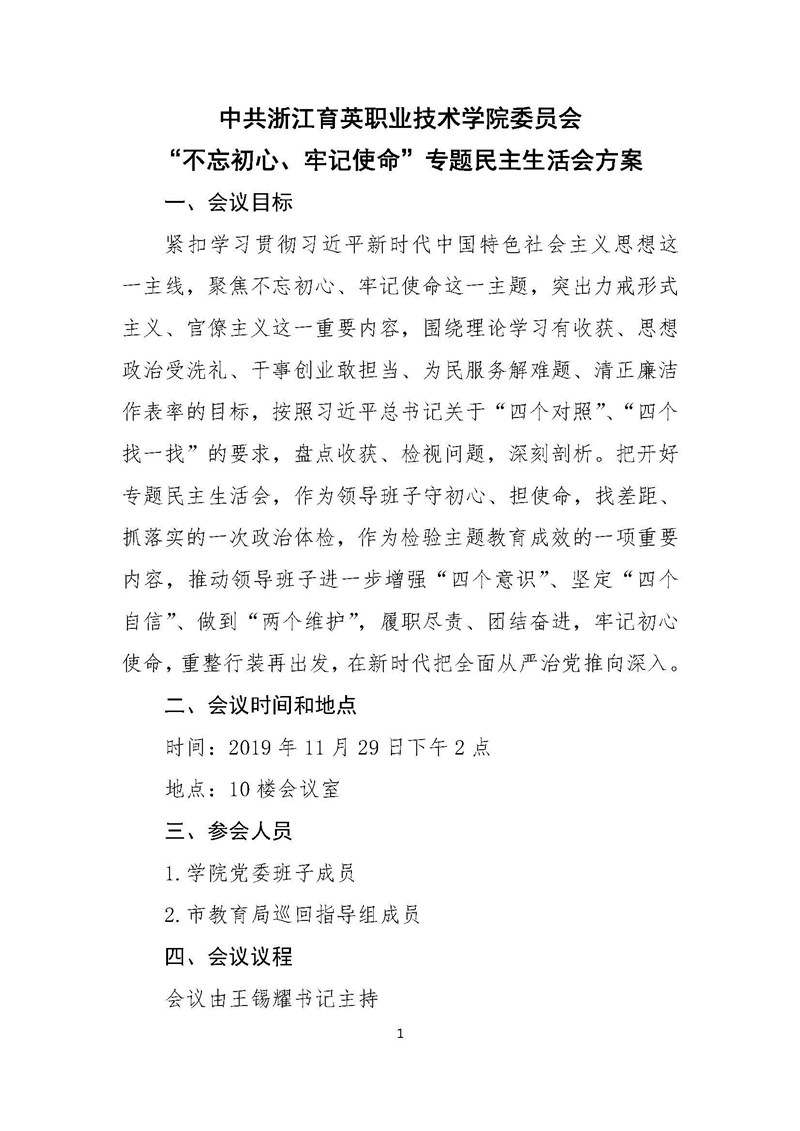 中共浙江育英职业技术学院委员会“不忘初心、牢记使命”专题民主生活会方案