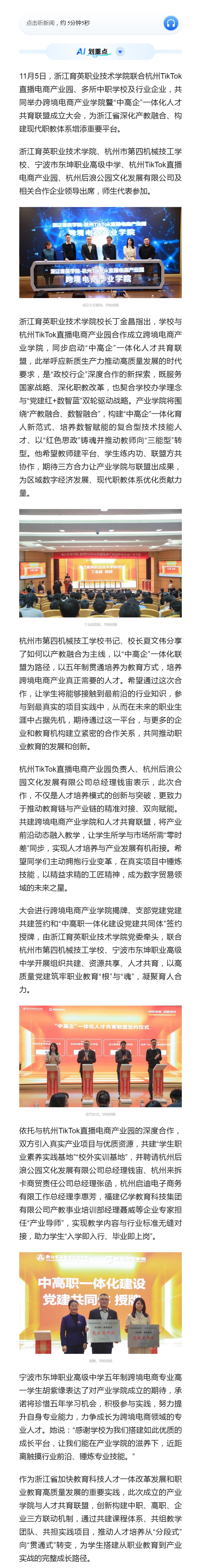 11月5日,浙江育英职业技术学院联合杭州TikTok直播电商产业园、多所中职学校及行业企业,共同举办跨境电商产业学院暨“中高企”一体化人才共育联盟成立大会,为浙江省深化产教融合、构建现代职教体系增添重要平台。