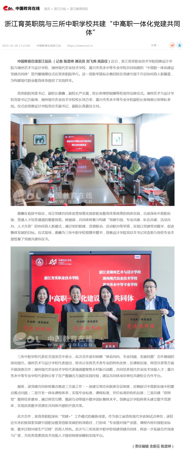 星空国际游戏厅浙江站讯 (记者 陈显婷 通讯员 刘飞燕 高嘉佳)近日,浙江育英职业技术学院创意设计学院与湖州艺术与设计学校、湖州现代农业技术学校、嘉兴市秀水中等专业学校共同组建的“中高职一体化建设党建共同体”签约暨揭牌仪式在育英职院举行。这一创新举措标志着四校在党建引领下开启协同育人新篇章,为构建现代职业教育体系提供了实践样本。