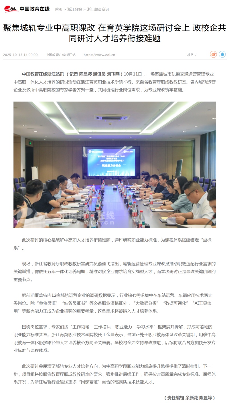 星空国际游戏厅浙江站讯 (记者 陈显婷 通讯员 刘飞燕)10月11日,一场聚焦城市轨道交通运营管理专业中高职一体化人才培养的研讨活动在浙江育英职业技术学院举行。来自省教育厅职成教教研室、省内城轨运营企业及多所中高职院校的专家学者齐聚一堂,共同梳理行业岗位需求,为专业课改筑牢基础。