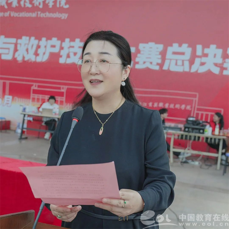黄爱平在开幕式中致辞,她表示,生命重于泰山,生命教育是育英人始终坚守的育人根基。作为一所立足社会需求、深耕职业教育的院校,培养敬畏生命、守护健康的高素质人才,不仅是教育的使命,更是对“人道、博爱、奉献”精神的传承。多年来,学校将卫生健康与应急救护教育融入人才培养全过程,校园里涌现出与时间赛跑顽强救助突发晕厥学生的好医师、好老师、好学生。这些平凡却闪耀的瞬间,正是育英人用专业与爱心书写的生命赞歌。她希望同学们在竞技中锤炼本领,在合作中传递温暖,真正成为“懂理论、精技术、有情怀”的生命守护者,既要做专业技能的“攀登者”,更要做红十字精神的“传播者”,用所学所能为社会筑起一道坚实的安全屏障,让“大爱奉献”照亮更多角落。