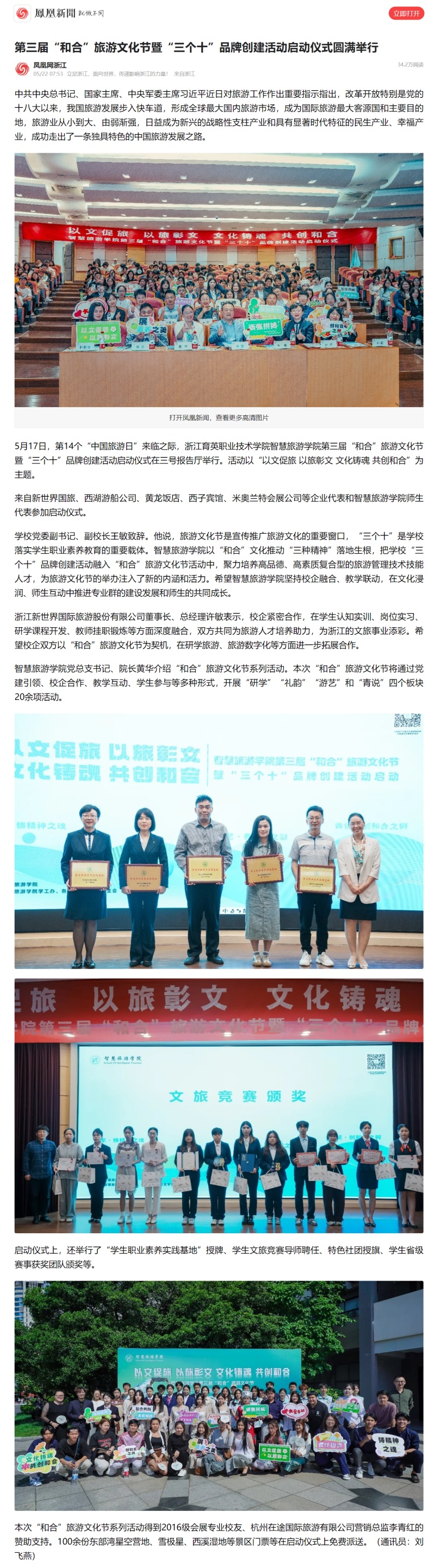 5月17日,第14个“中国旅游日”来临之际,浙江育英职业技术学院星空彩票体育app平台第三届“和合”旅游文化节暨“三个十”品牌创建活动启动仪式在三号报告厅举行。活动以“以文促旅 以旅彰文 文化铸魂 共创和合”为主题。
