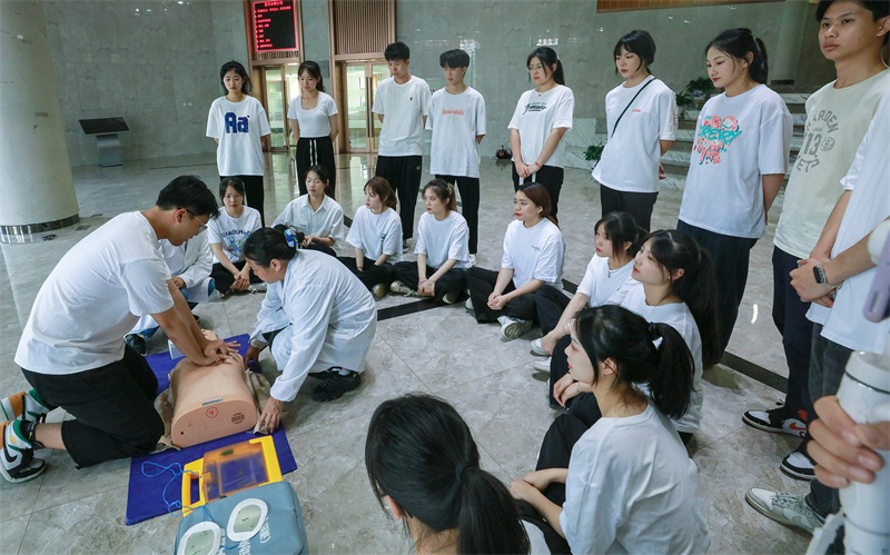 浙江育英职业技术学院医疗保健中心主任茅小燕和相关医务工作者为学员们讲解了“红十字会组织”相关概况,详细介绍了心肺复苏、创伤救护等内容。通过理论结合实操,引导提问、现场展示、视频观看、案例分析等方式,传授伤病者状态判断、胸外按压、开放气道、人工呼吸、自动体外除颤仪(AED)使用、各类创伤包扎等关键急救技能。