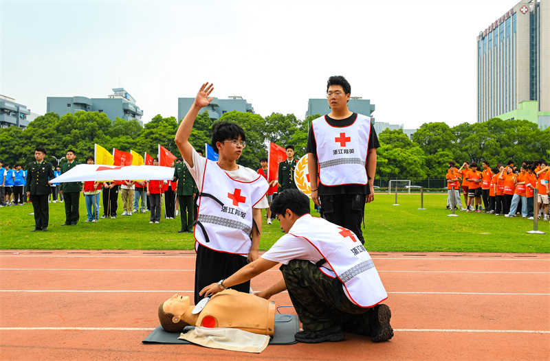 学校作为全国急救教育试点学校,连续19年开展卫生健康知识与急救技能竞赛。作为杭州市红十字会钱塘区应急救护实训基地、应急救护考点、应急救护实操体验点,还提供红十字应急救护培训平台地图服务,面向钱塘区居民和学校提供应急救护实操体验和救护员培训、考核服务,推动急救教育走深走实。利用“志愿者服务”拓展急救教育受益面,成立师生共同参与的育英“急救侠”应急救护志愿服务队,更广泛范围参与普及急救知识和技能。在学生暑期三下乡活动中,组织志愿者队伍进入农村科普急救知识和技能,扩展急救教育辐射面和受益面,同时增强师生社会责任感,造福社会。