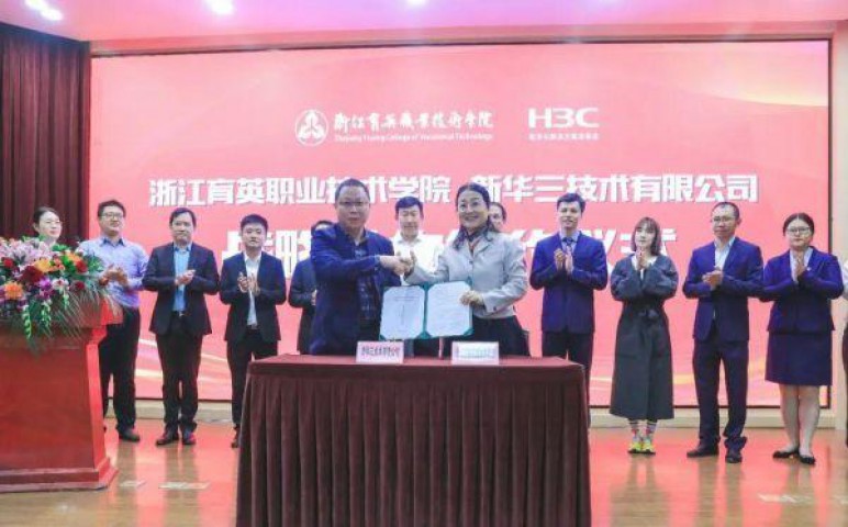 丁金昌致辞。他介绍了学校基本情况,并表示,本次战略合作签约,是学校与企业“无缝对接”,专业与产业“同频共振”,深化产教融合的实质性举措。他说,育英学院和新华三都是习近平总书记曾经视察过的单位,习近平总书记的殷切嘱托一直激励着育英人不断向前奋进。经过多年发展,学校特色和优势更加明显,所有专业紧密对接浙江省、杭州市支柱产业。自建校以来,学校坚持立德树人,主动适应市场需求,着力于培养高素质复合型技术技能人才,精心设计人才培养方案,不断深化产教融合,全面推动与头部企业全方位合作,分别成立了“育英-深信服产业学院”“育英-海尔智家智慧零售产业学院”等产教融合载体。本次与新华三合作的信息技术专业群,在专业建设、教学改革中成果丰富,尤其是赛教融合的教学特色明显,学生在各类竞赛中获得特等奖、一等奖百余项,在浙江省乃至全国具有较大影响力。新华三集团作为数字化解决方案领导者,深度布局“芯-云-网-边-端”全产业链,不断提升数字化和智能化赋能水平。校企双方可以在人才培养、实践基地建设、团队共建、课程共享、职业证书开发、党建共建等方面进行深度合作、资源共享、优势互补,达到学校、企业、学生三位一体的有机结合,最终实现三方共赢。