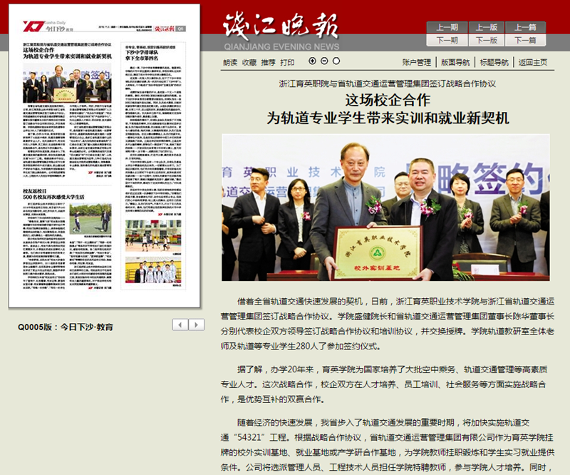 借着全省轨道交通快速发展的契机,日前,浙江育英职业技术学院与浙江省轨道交通运营管理集团签订战略合作协议。学院盛健院长和省轨道交通运营管理集团董事长陈华董事长分别代表校企双方领导签订战略合作协议和培训协议,并交换授牌。学院轨道教研室全体老师及轨道等专业学生280人了参加签约仪式。
