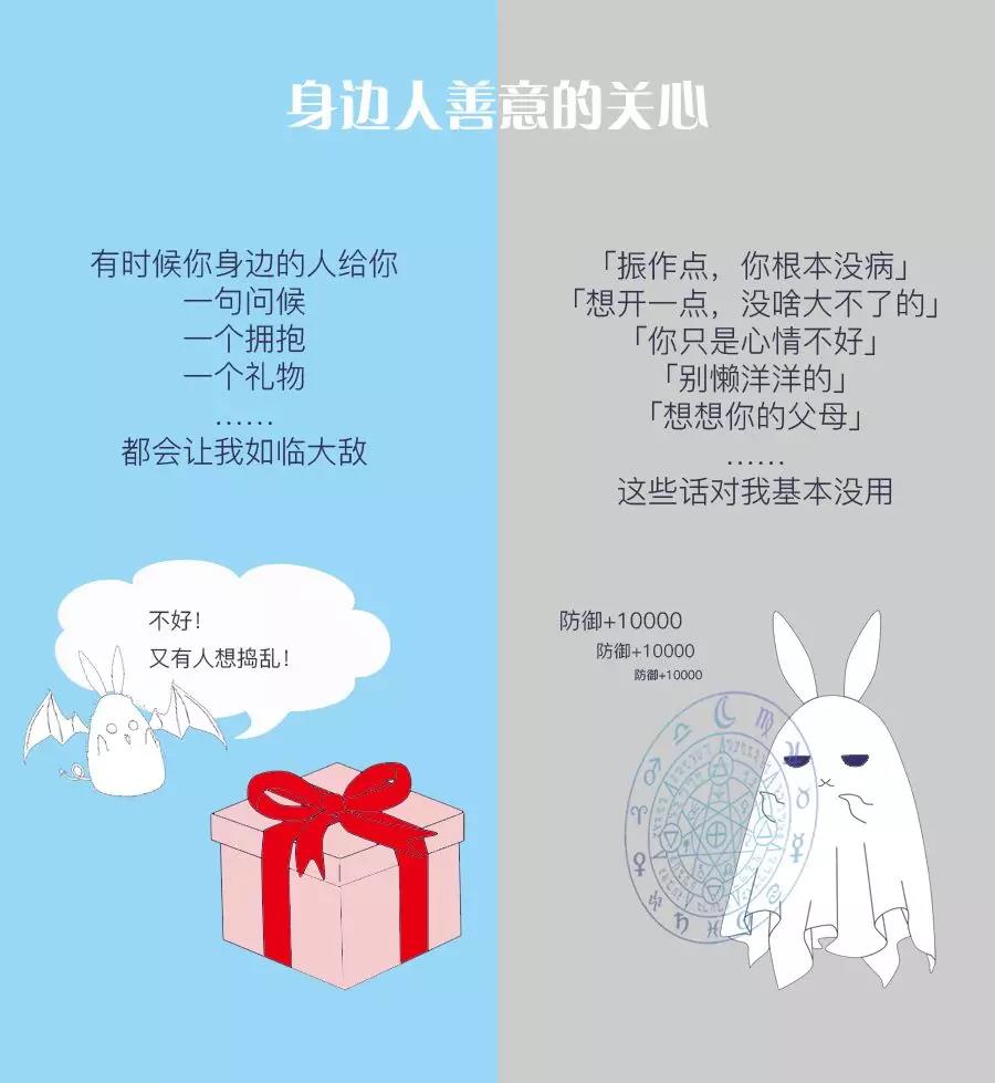 当一个人对你说出自己得了抑郁症的时候,TA一定是下了很大的决心,希望能得到你的理解和支持,如果你简单地用自己的抑郁情绪去和对方的疾病类比,可能会令TA感到愤怒。