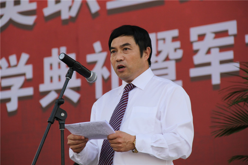 丁华忠发表讲话,他向执训教官提出要求,要文明军训、文明管理,文明教育,体现军人的良好形象;善于与校方沟通,与指导老师沟通,与学生沟通,保持良好的教、训、学的氛围;将所带班级打造成为教学一体、训练有素的团队。他也向参训同学提出要求和希望,要学习不怕吃苦、不怕困难的崇高品质;要发扬齐心协力、团结向上的光荣传统;要坚持严于律己、服从教官和班主任的管理,用铁一般的纪律坚决完成军训各项训练;希望同学们敢于吃苦、敢为人先,发扬流血流汗不流泪、掉皮掉肉不掉队的坚定意志完成军训。