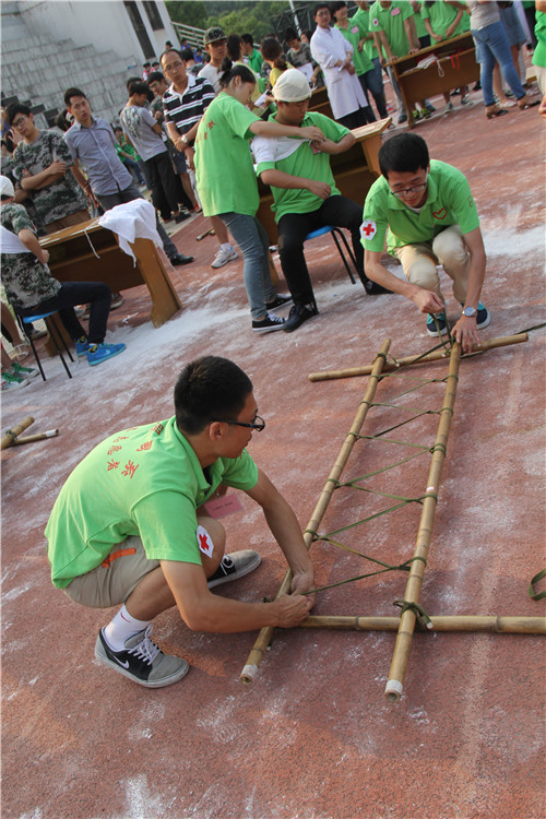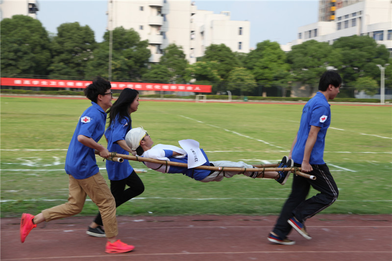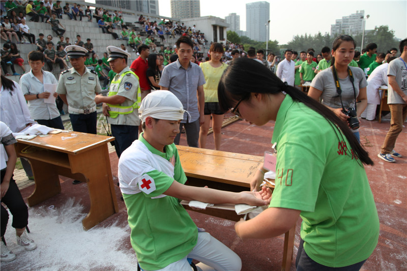 此项比赛已连续举办10年,面向每届新生,全员参与,成为学院特色学生活动项目。除笔试外,技能操作包括:头部外伤包扎、单侧胸部外伤包扎、前臂骨折的固定、担架的制作、搬运伤员50米,此次参赛的220名队员动作娴熟、准确到位、操作快速,一切紧张而有序。