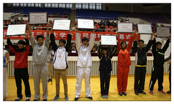 11月8日-11日,浙江省第三届大学生田径锦标赛在浙江理工大学举行。我院田径队派出18名运动员参赛,战果辉煌。运动健儿摘9金夺6银7铜13人次破9项纪录,获团体总分第一名,男子团体总分第一名,女子团体总分第二名,女子撑杆跳高包揽前三名3人破纪录,男子十项全能包揽前三名1人破纪录。
