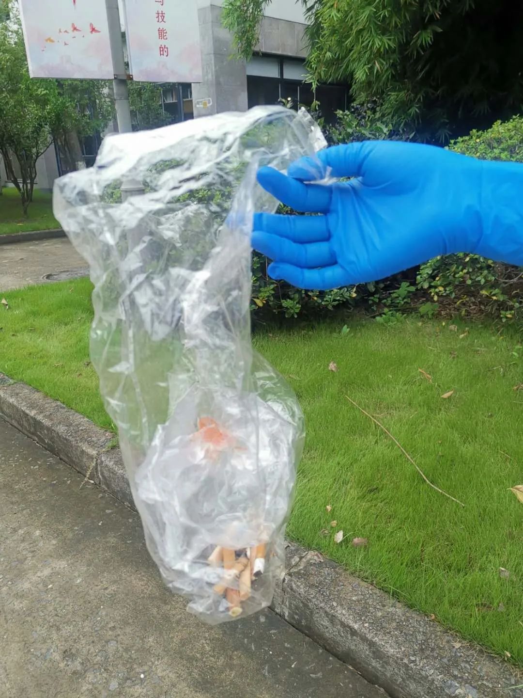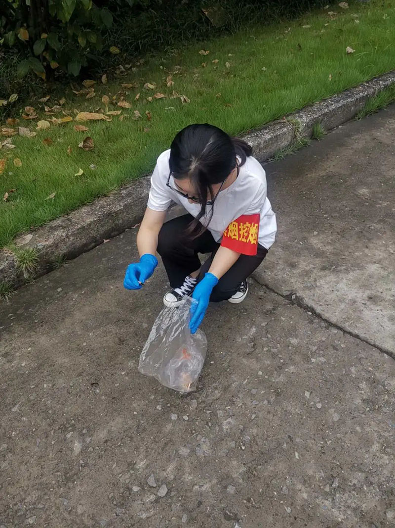 参与活动的同学手臂上套着红袖章,在教学楼内巡视,以确保在公共场合无吸烟现象,致力于为同学们营造一个良好的学习环境。同时在花坛边、公共卫生间等地方看到烟头,也会及时帮我们清理掉。