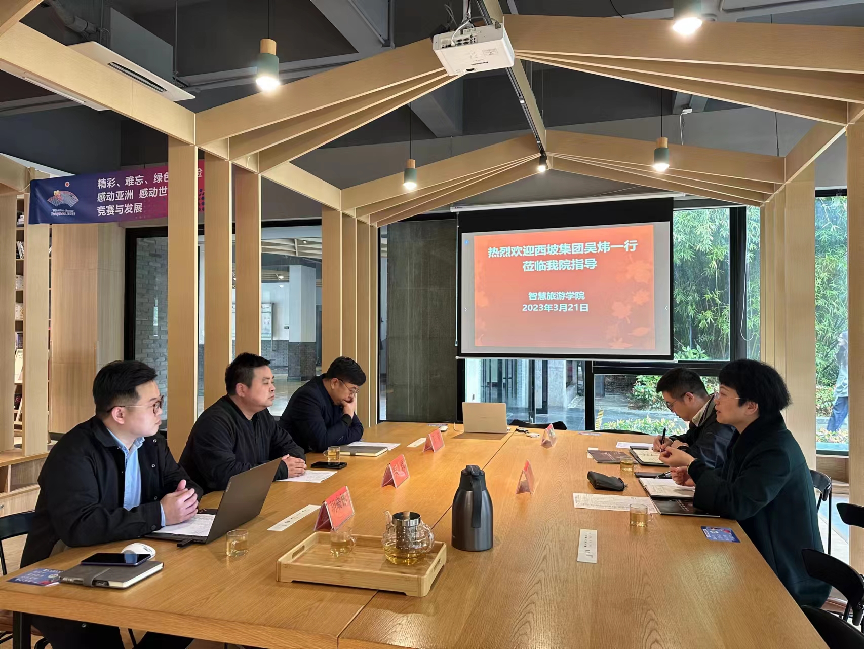 21级3月21日上午,民宿行业的领军品牌西坡民宿集团总经理吴炜一行三人前来学院洽谈校企合作事宜,学院副院长、专业负责人周岚老师和酒店教研室相关老师参加了会谈。