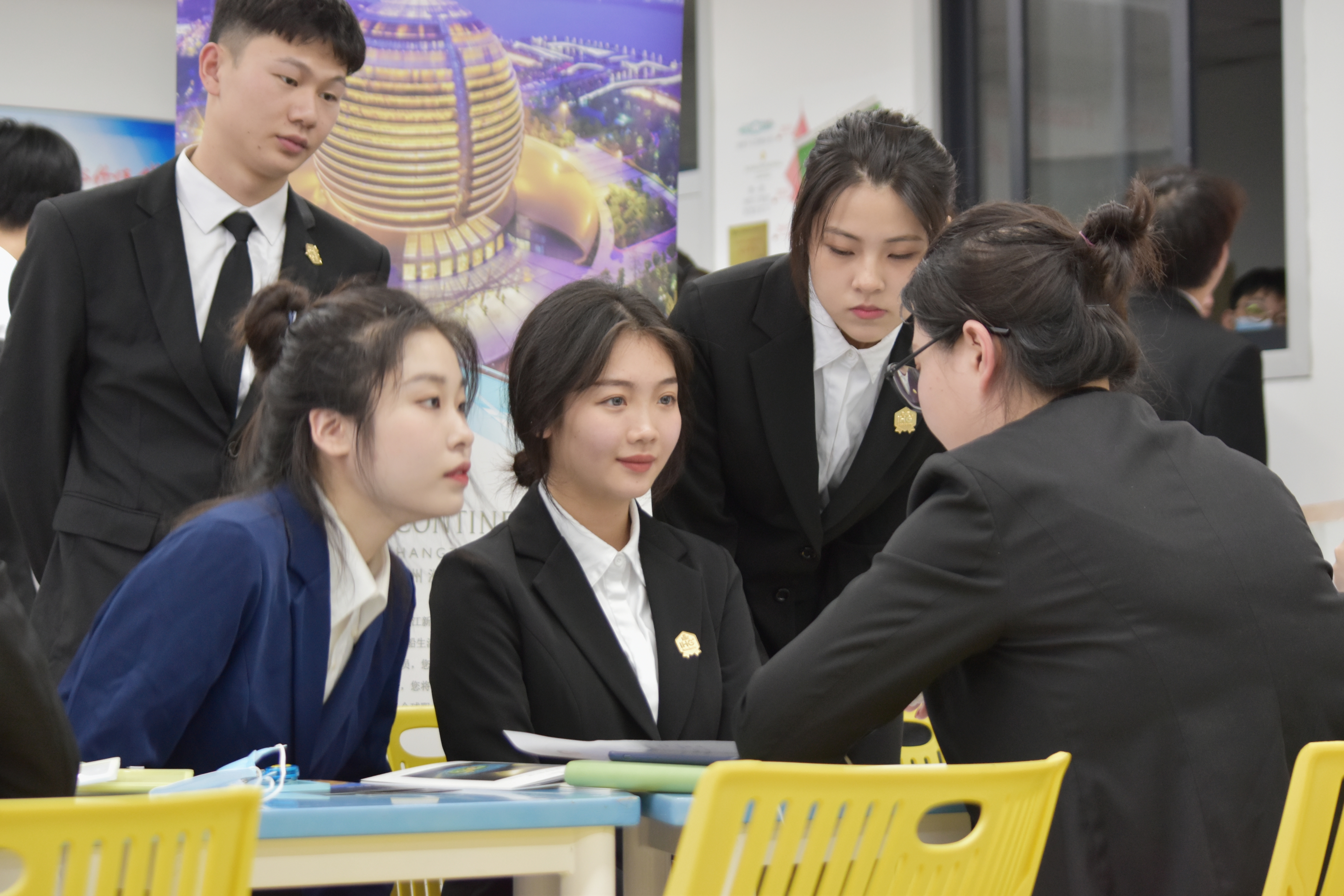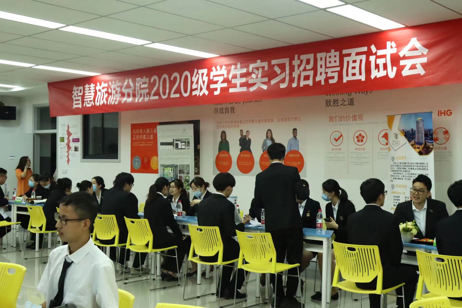 继6月7日、8日杭州黄龙饭店、杭州纳德酒店股份有限公司、湘湖逍遥庄园、杭州大华饭店、浙江西子宾馆、之江饭店、杭州泛海钓鱼台酒店、杭州新新饭店、杭州柏悦酒店、杭州西溪悦榕庄酒店等10家企业开展顶岗实习招聘线上宣讲活动之后,酒店专业20级的学生根据自己的意愿分别填报了自己心仪的酒店和岗位,并于6月10日参加了这10家酒店的面试选拔。10家酒店率领着自己的面试官团队于下午13:30在1303A摆开面试摊位,20级酒店专业的学生根据自己的意向有序的在各自的酒店面试摊位前面排队等候。学院领导、智慧旅游分院领导、实践教研室老师以及酒店教研室的专业老师、辅导员也亲临现场,对学生的仪容仪表、自我介绍、问题对答等方面进行现场指导。学校就业办安排了“导师面对面”现场咨询活动,两位专业的导师帮助学生解答关于实习就业过程中的问题。10家酒店均非常认真仔细地在挑选着自己的准员工,学生们也怀着憧憬、紧张、兴奋的心情完成了自己的面试任务。接下来,教研室会在各家酒店面试录取结果上,结合学生意愿,最终确定10家酒店的实习成员