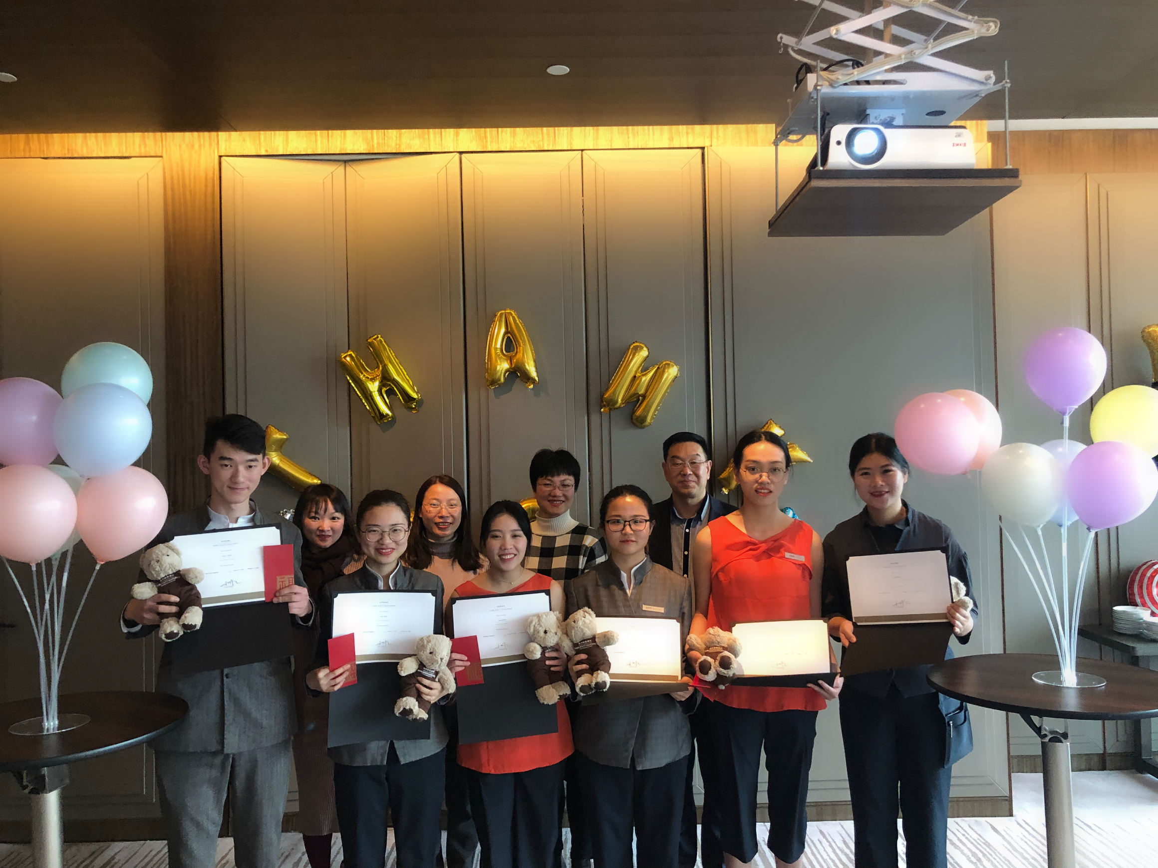 柏悦酒店为这次欢送会精心准备了会场,五颜六色的气球、美味的蛋糕、果汁,酒店人力资源部总监、酒店管理层代表、负责实习生管理的工作人员均出席了此次欢送会。酒店领导和分院领导分别给同学们颁发了实习结业证书和奖学金,还有柏悦酒店的吉祥物。分院领导谢院长、周院长也都对同学们表示了感谢、提出了期许,每一位同学也都表达了自己的实习感受。酒店代表也分别表达了酒店对同学们的感谢和祝福,大家在谈到与同学们的相处时有着满满的感动。我们的同学都很棒,他们对待工作认真负责、虚心学习,从不会到会,一直的坚持,积累了丰富的服务经验,锻炼了自身的沟通能力。会上,酒店人力资源部门工作人员播放了学生自进入酒店后的各方面情况,看到了同学们一步步的成长和蜕变,我们相信同学们在柏悦酒店这个有爱的集体里不仅可以获得专业知识和技能,还学会了如何为人处世,为接下来的就业打下了坚实的基础。
